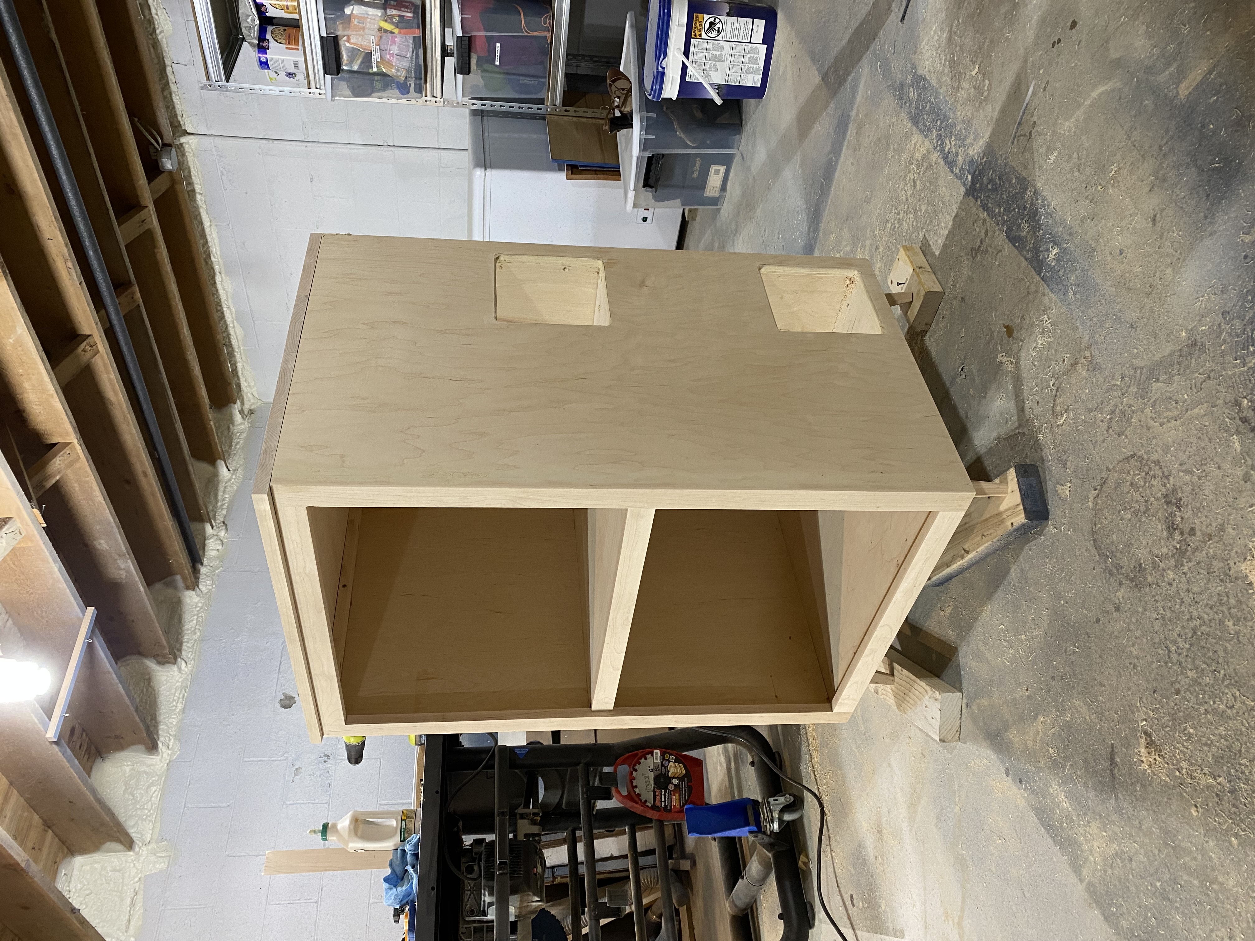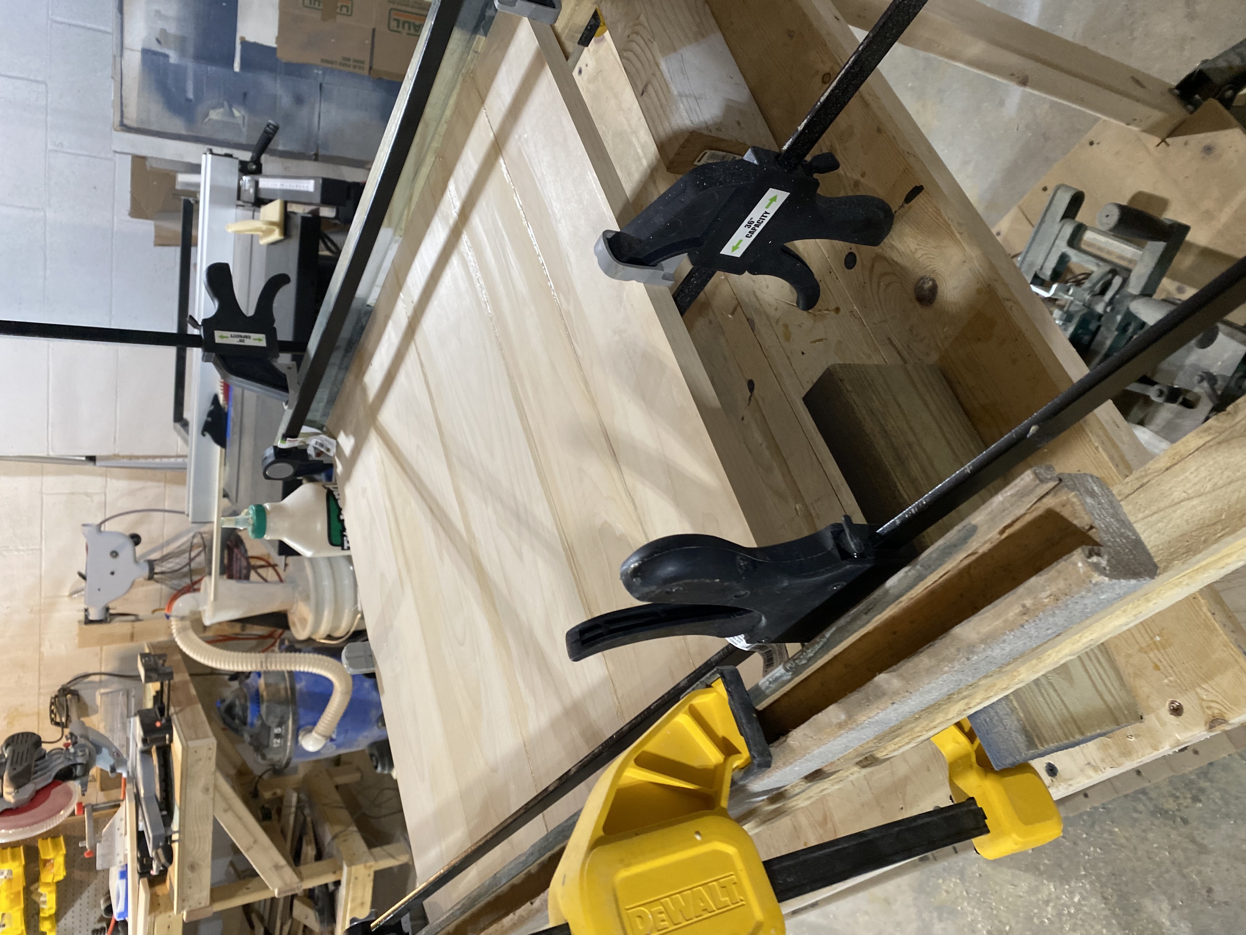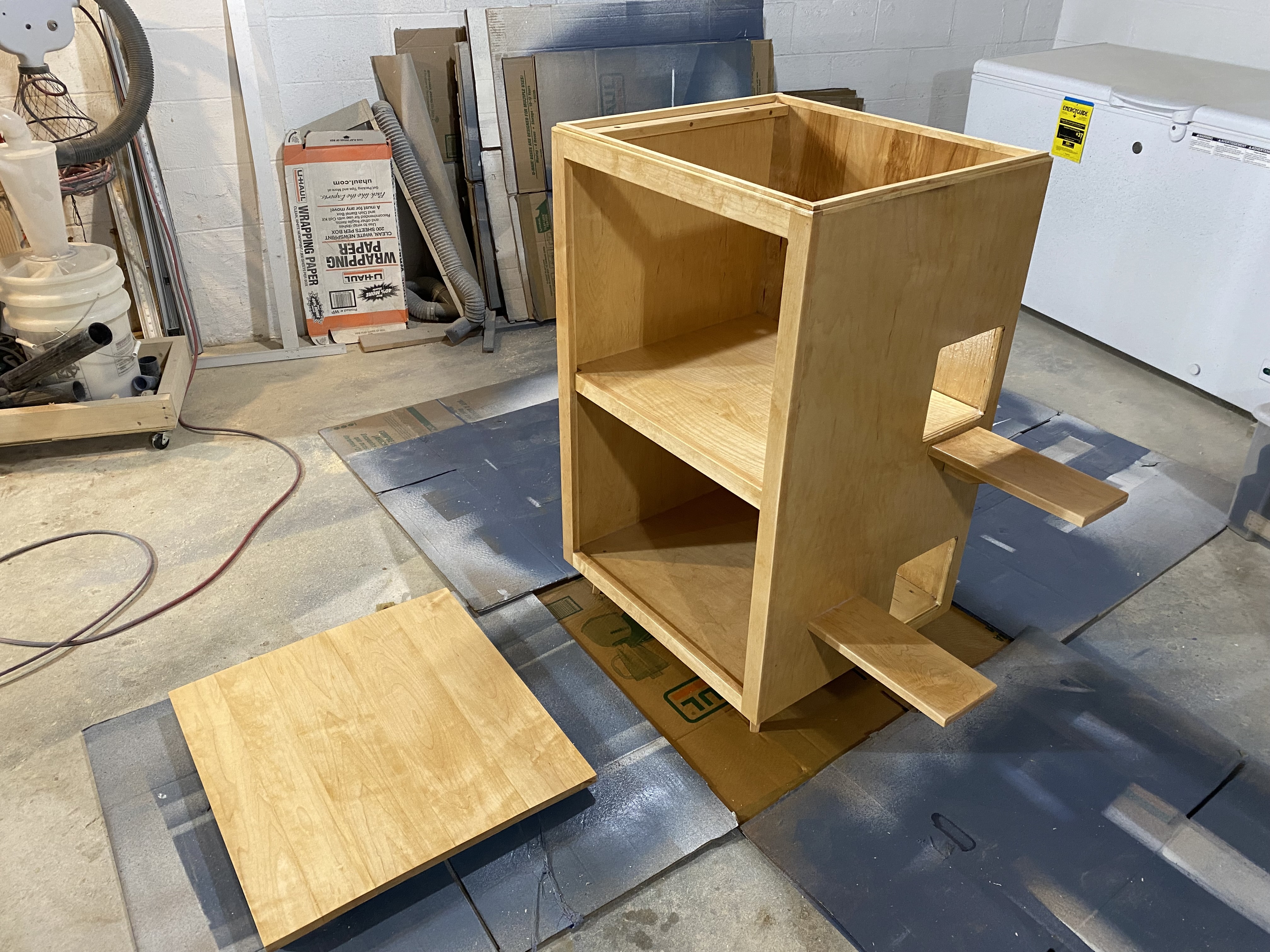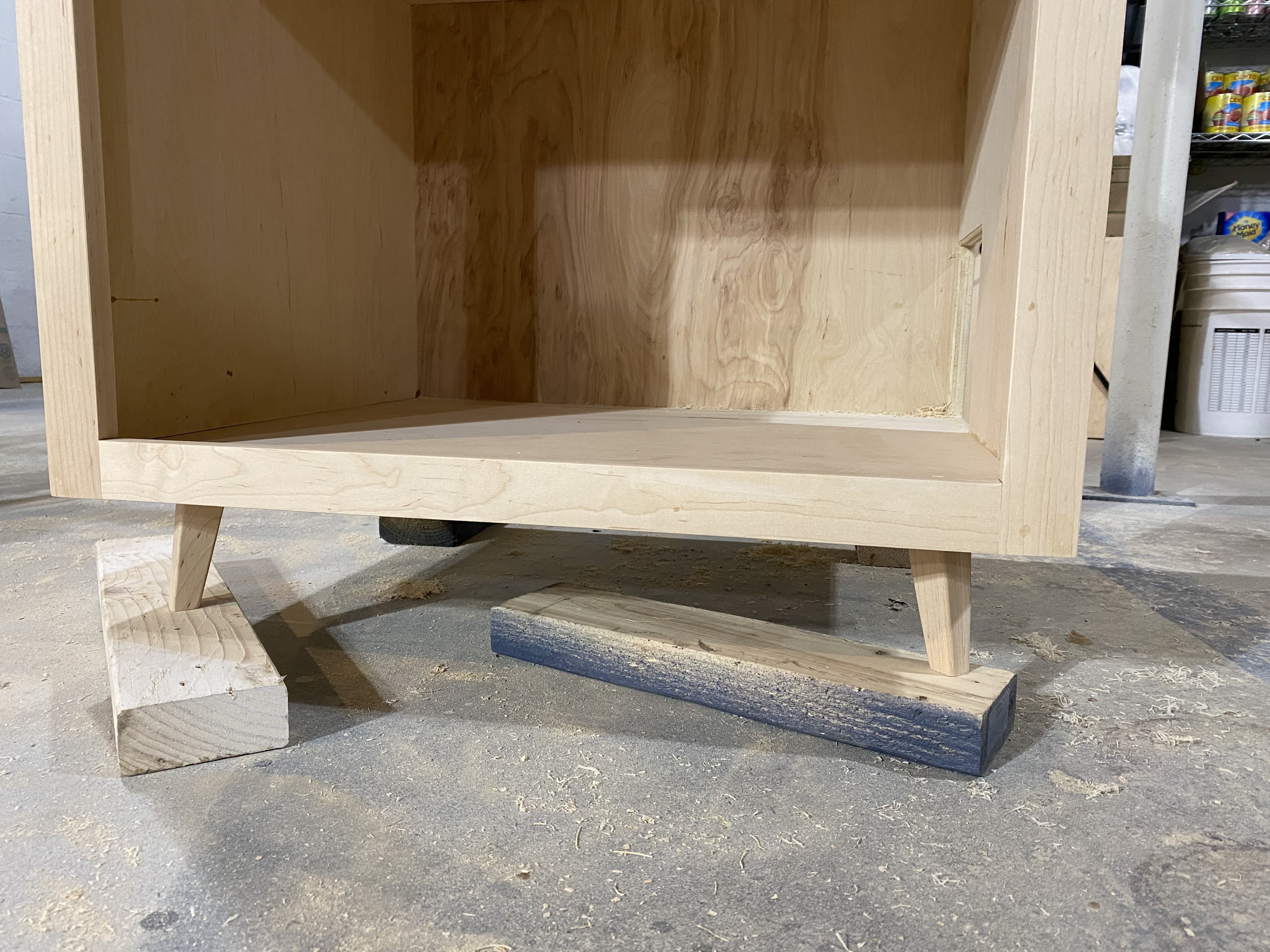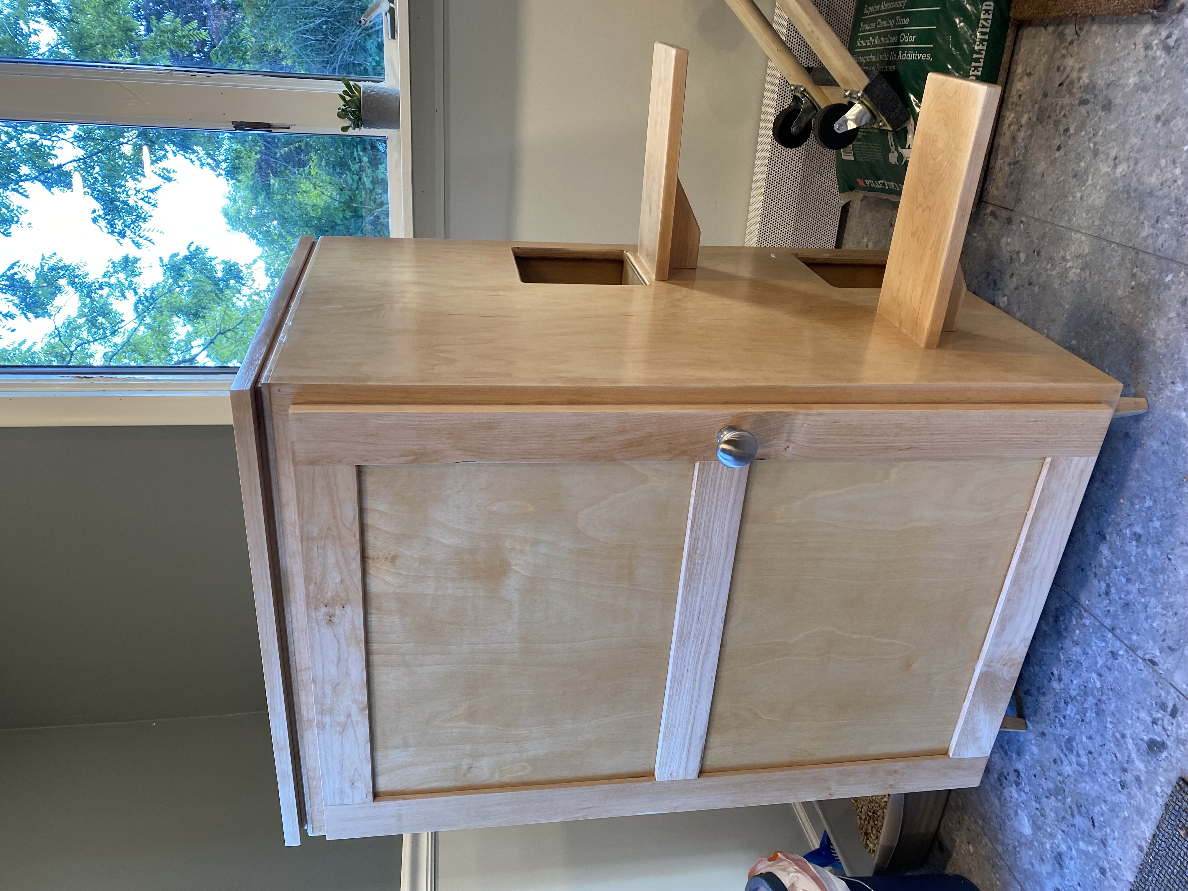 Cabinet top panel being glued and clamped in the workshop, showing solid maple construction with multiple clamps securing the frameFront view of the unfinished cabinet showing the two-compartment design with cutouts in the side for cat entry pointsClose-up of the cabinet legsUnfinished cabinet with attached external stairs and top panel laid out on the floor, showing the two-story constructionFront view showing the finished cabinet with frame-and-panel door design, solid maple legs, and decorative grain-matched panels