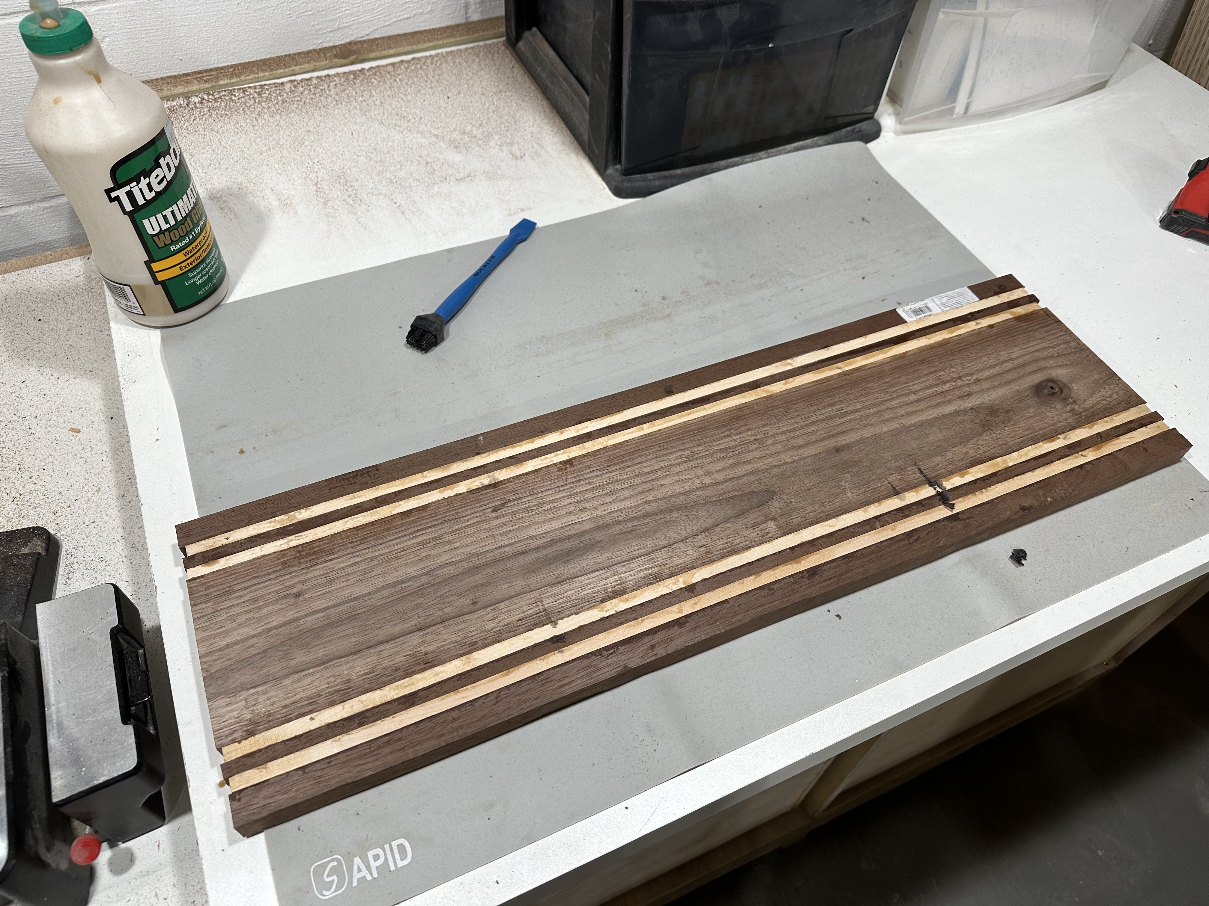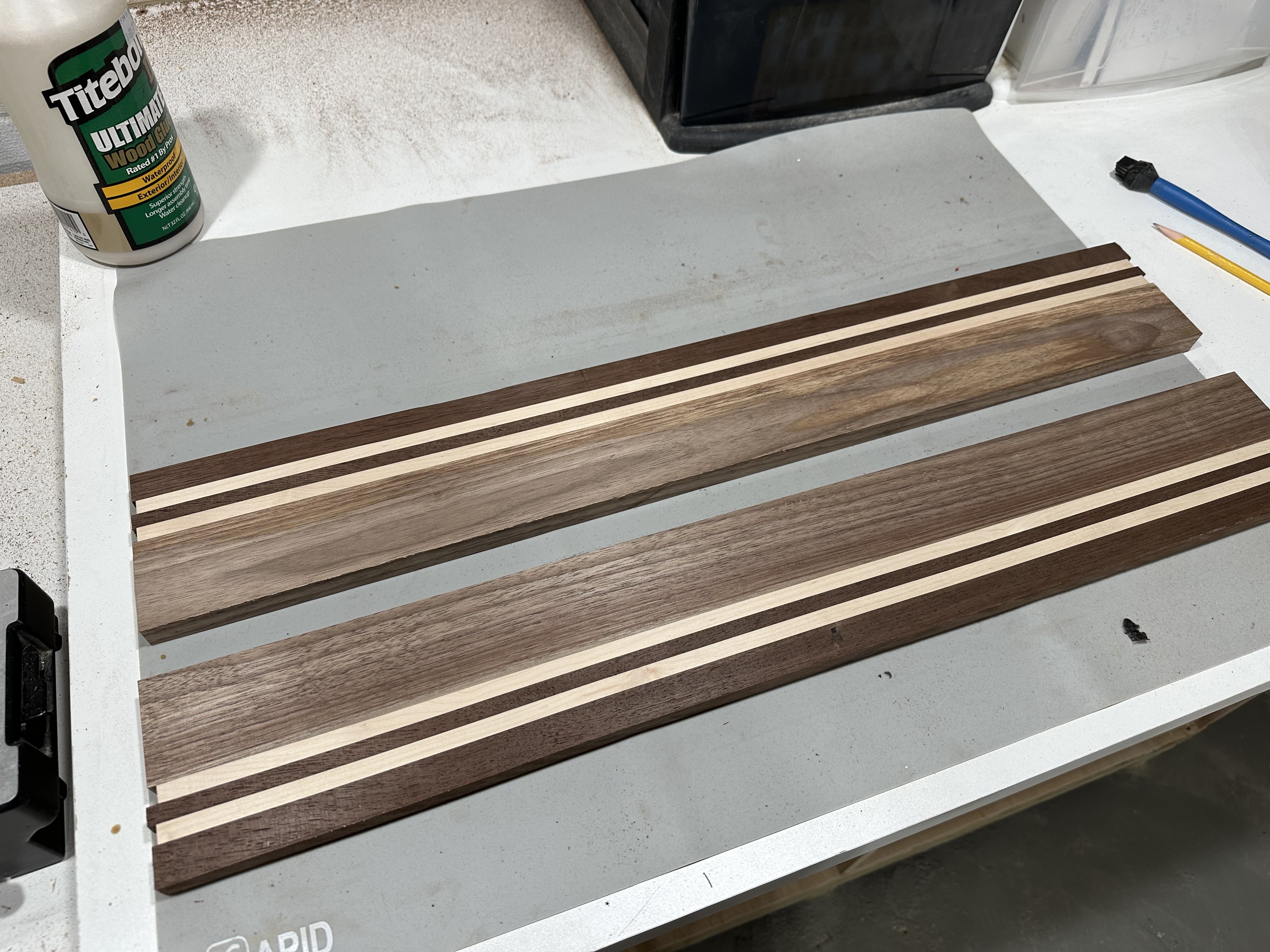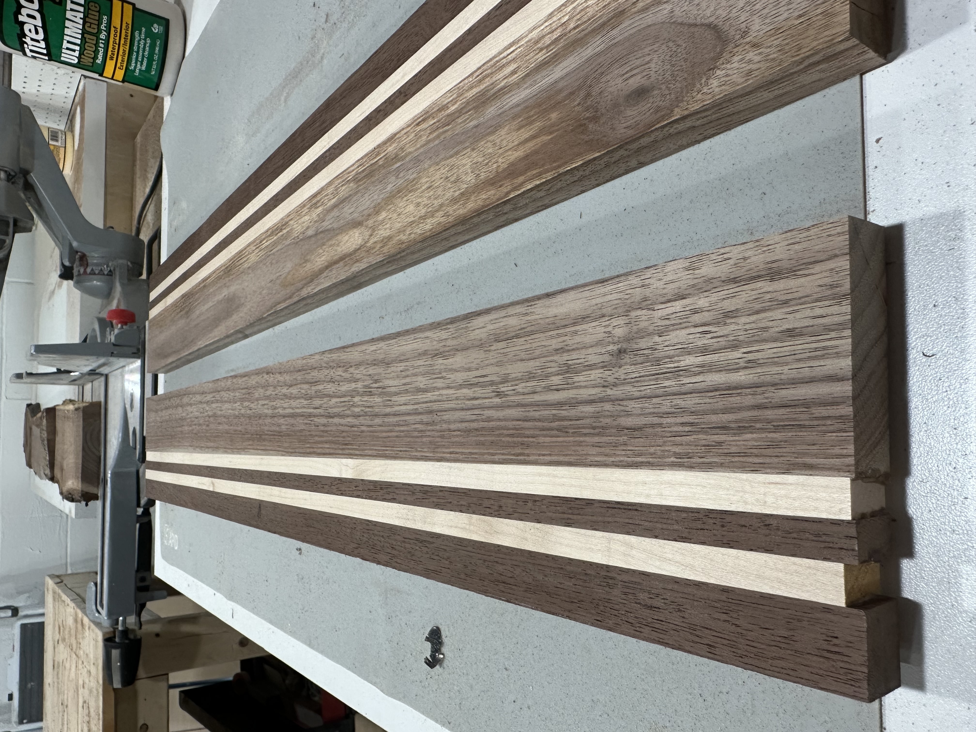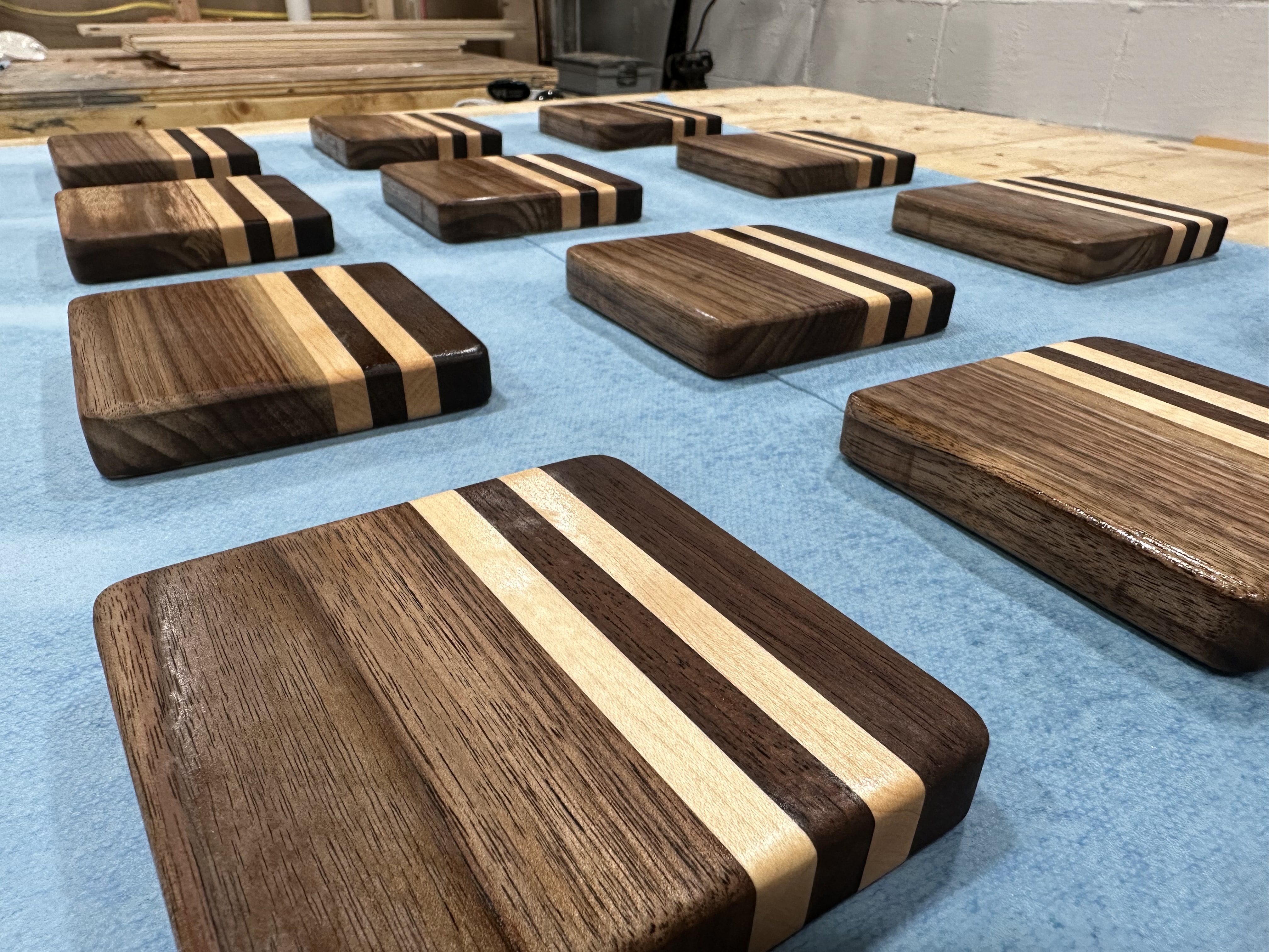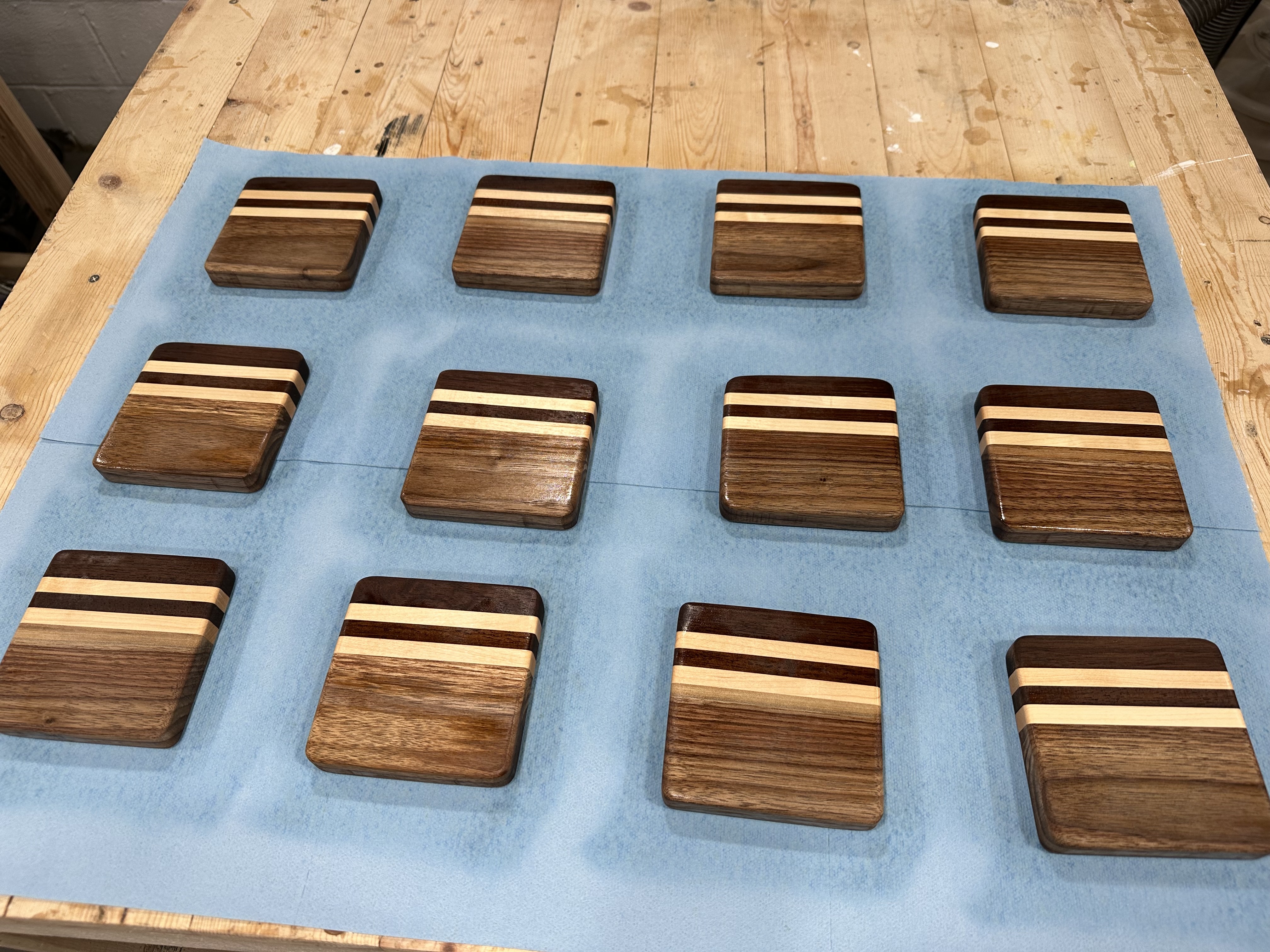 Glued-up coaster blank on workbench showing alternating walnut and maple strips, ready to be cut into individual coastersThree glued-up coaster blanks displaying the striped pattern of alternating dark walnut and light maple woodSide view of coaster blanks showing the clean edge joints and consistent thickness of the laminated walnut and maple stripsTwelve finished coasters laid out in rows, each featuring two maple stripes through dark walnut with rounded corners and glossy finishFinished coasters arranged on workbench showing variety in wood grain patterns and the consistent striped design across the set