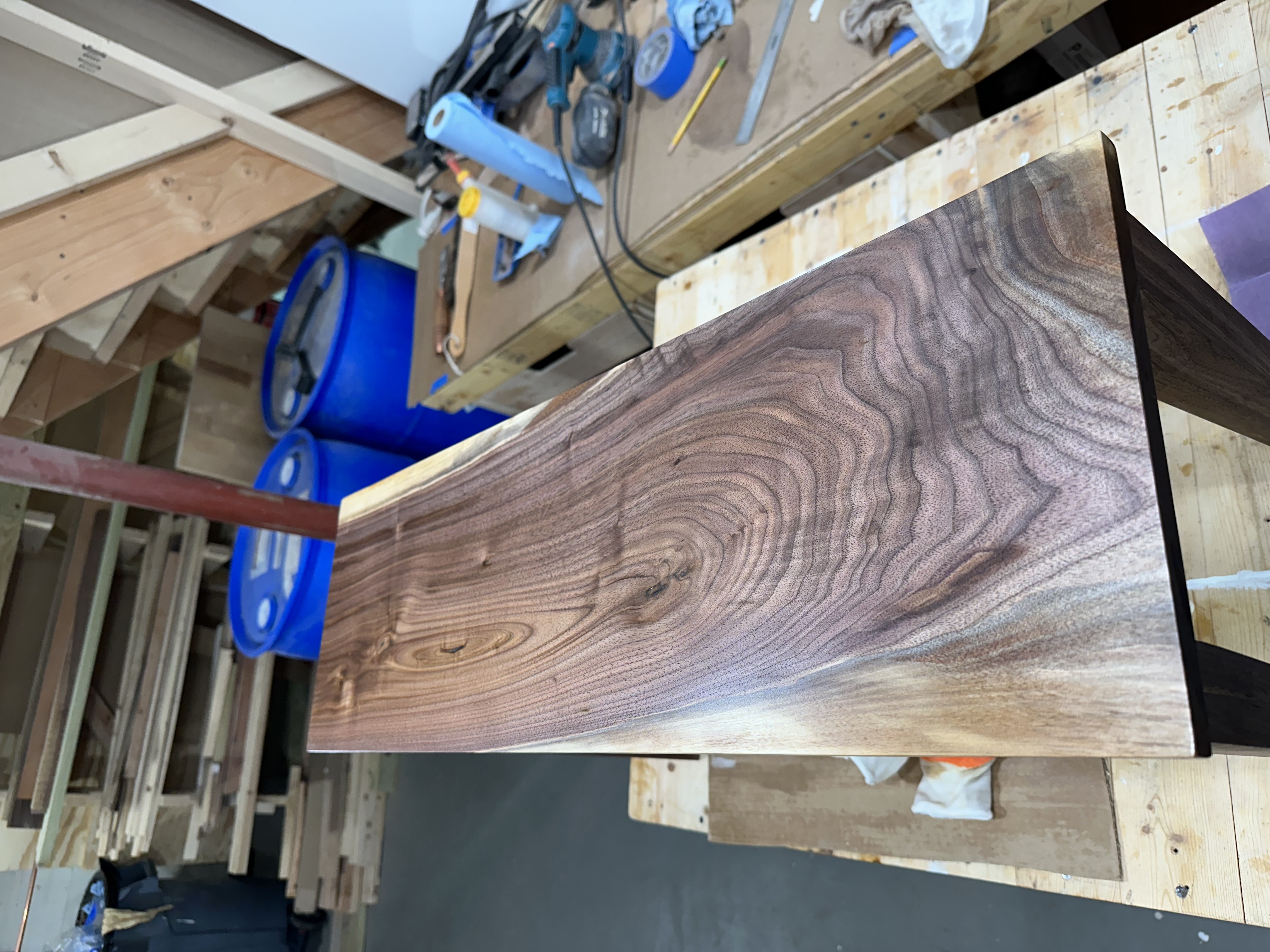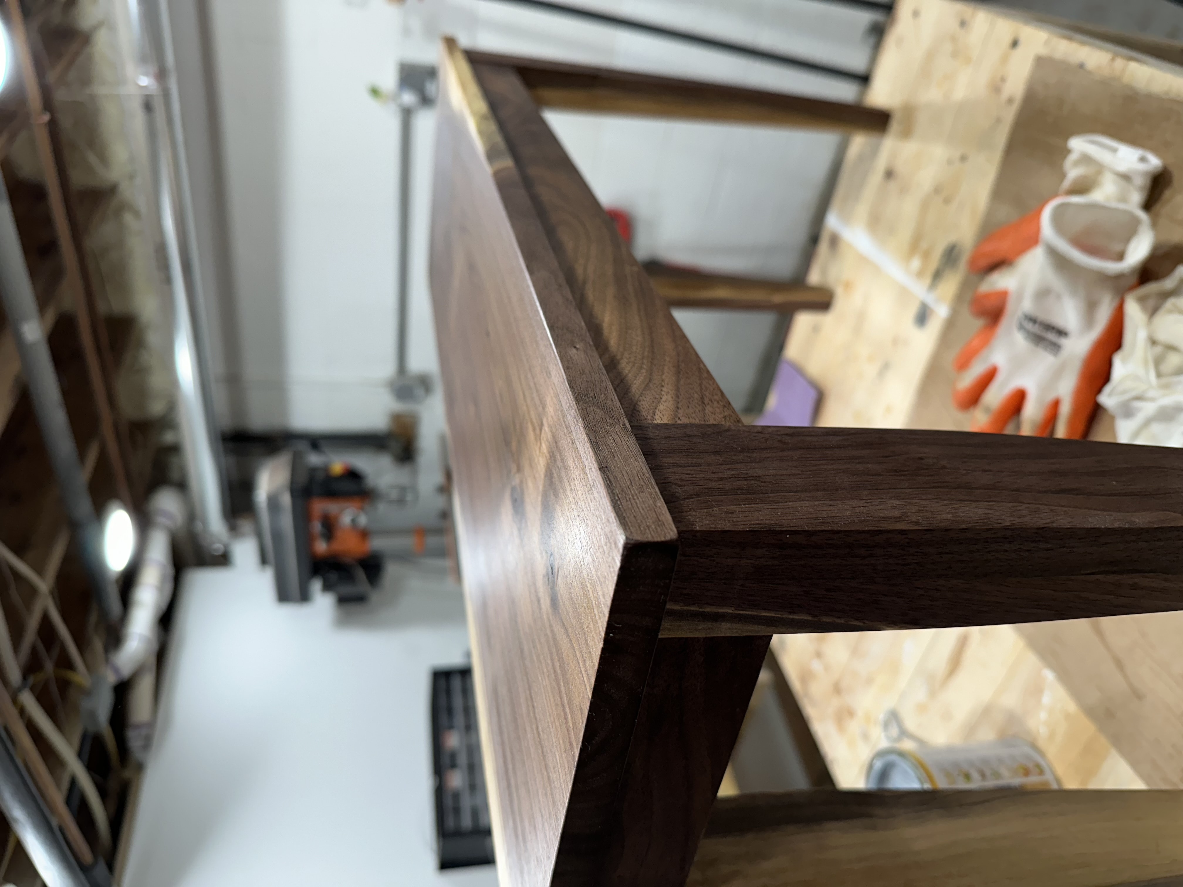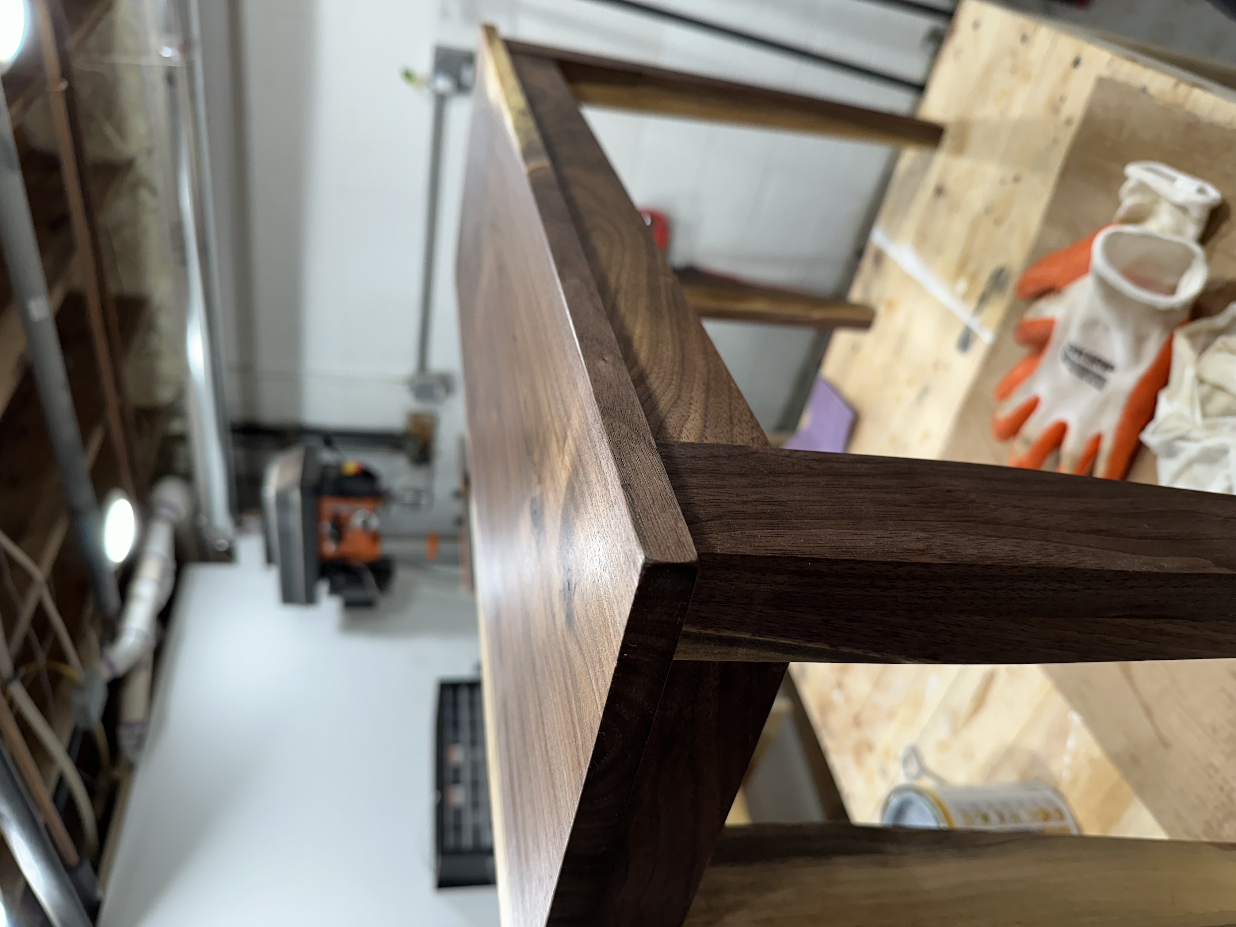 Completed black walnut entryway bench in the workshop, featuring a satin finish on the top and angled leg constructionClose-up view of the bench corner showing the dark walnut grain and the mortise and tenon joinery between the top rail and legAngled detail of the bench corner highlighting the joinery and color variation in the air-dried black walnutFull view of the bench structure from the side, showing the angled leg design and lower stretchers connecting the legsView of the bench top showing the natural grain patterns and swirling figure in the air-dried black walnut slab