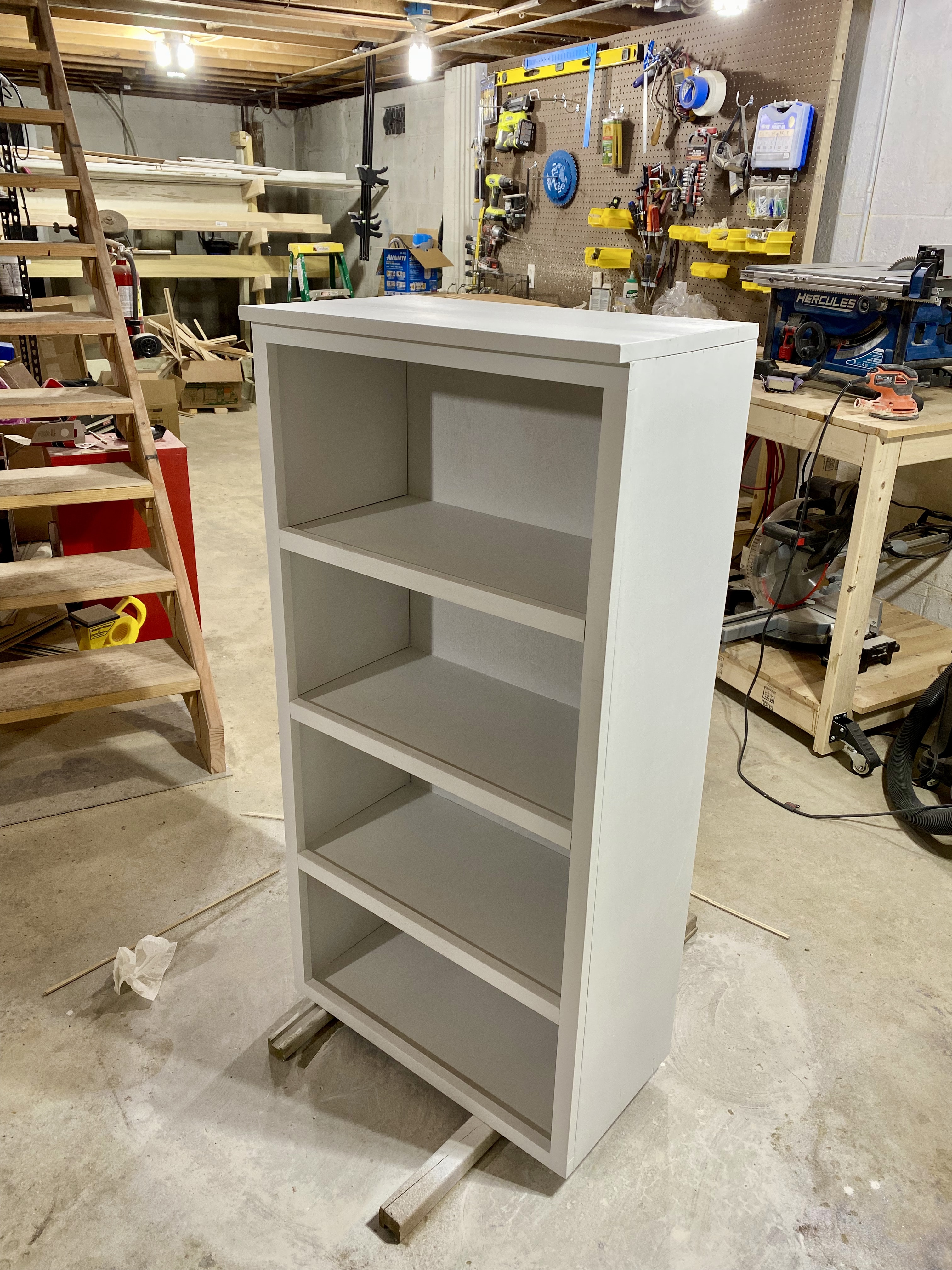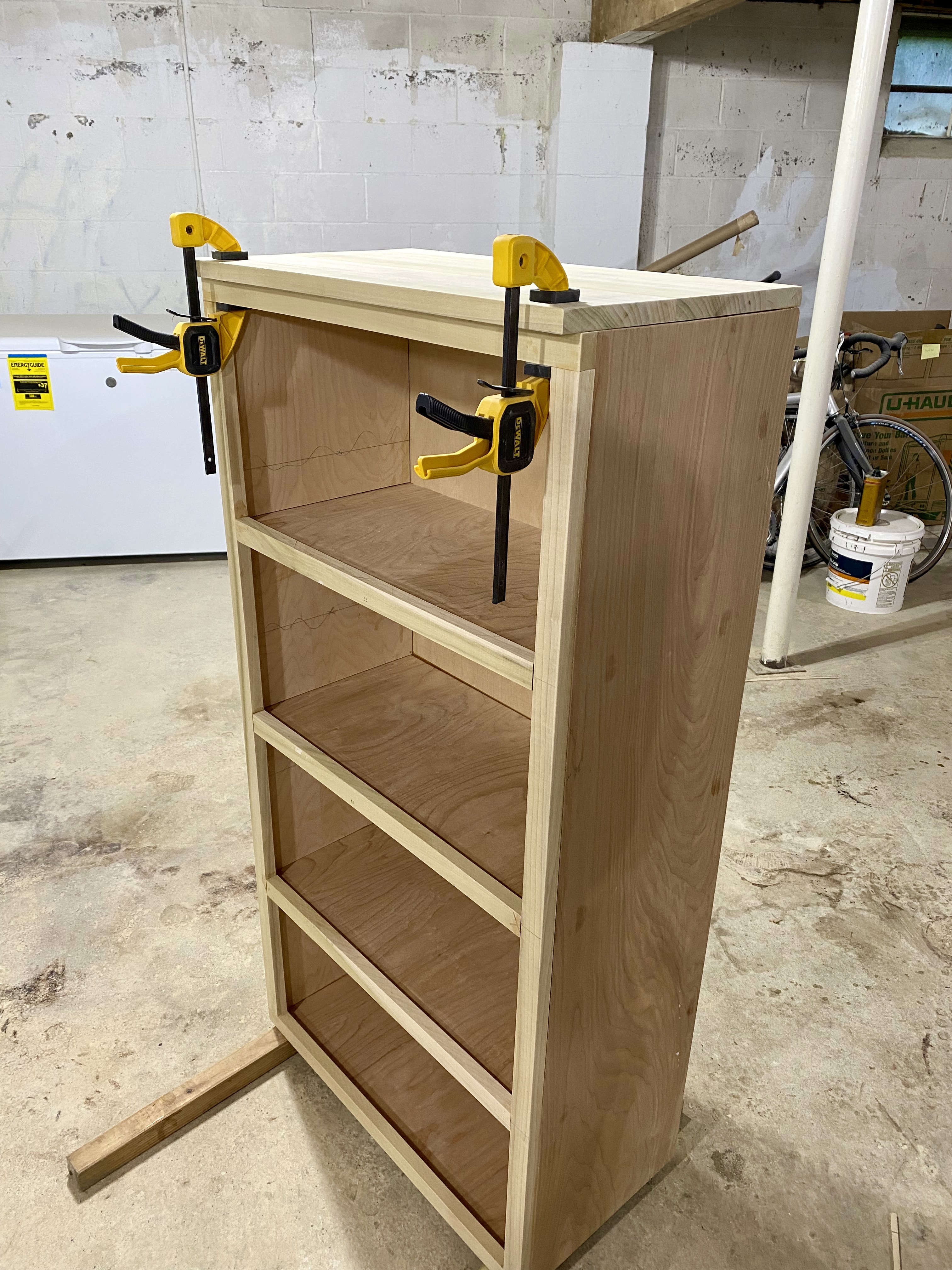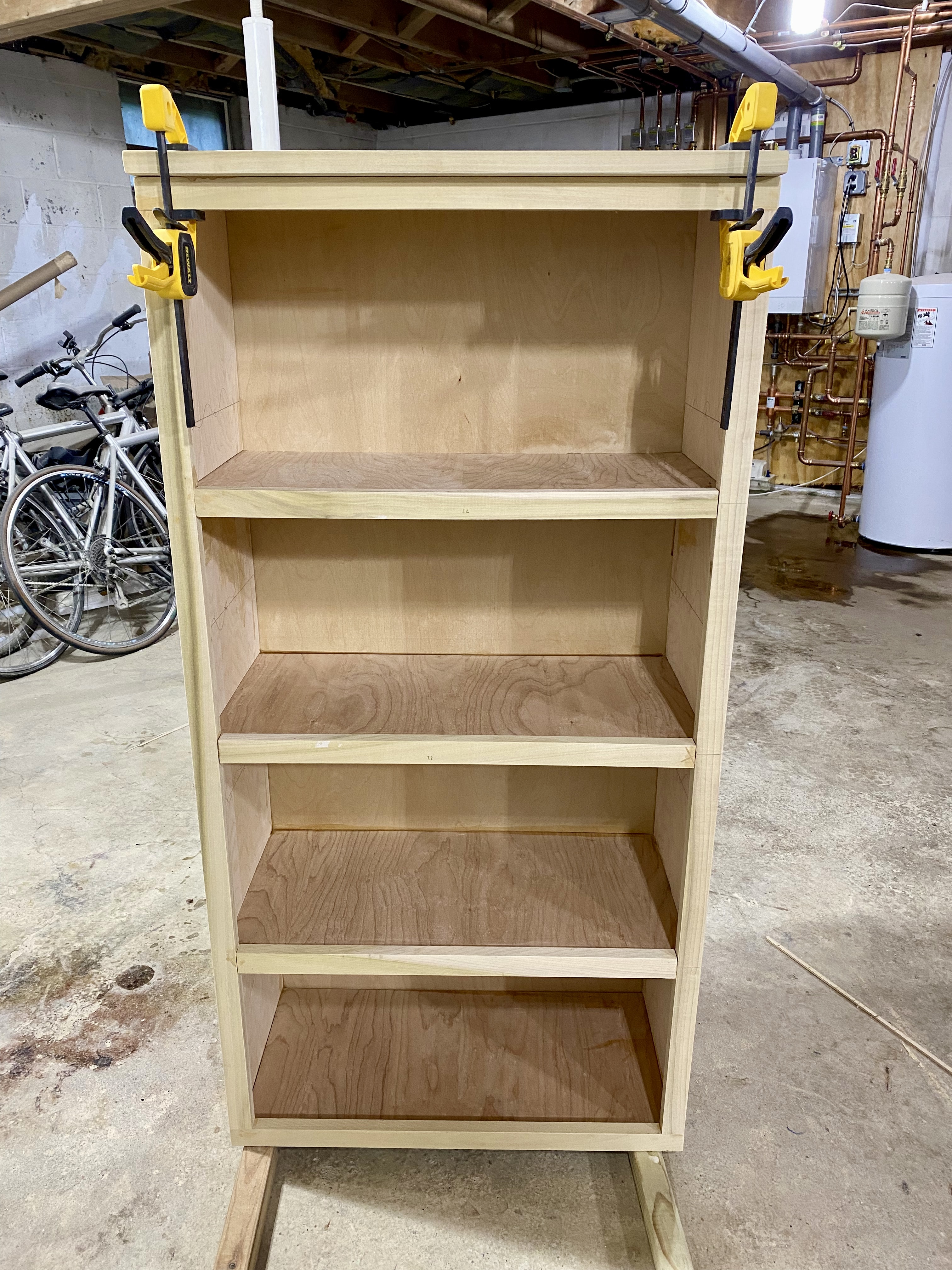 Home office bookshelf made from ½" birch plywood and ¾" poplar. The poplar faceframe and top conceal plywood edge grain. Shelves are set in ¼" dados routed into the sides with a rabbeted bottom.