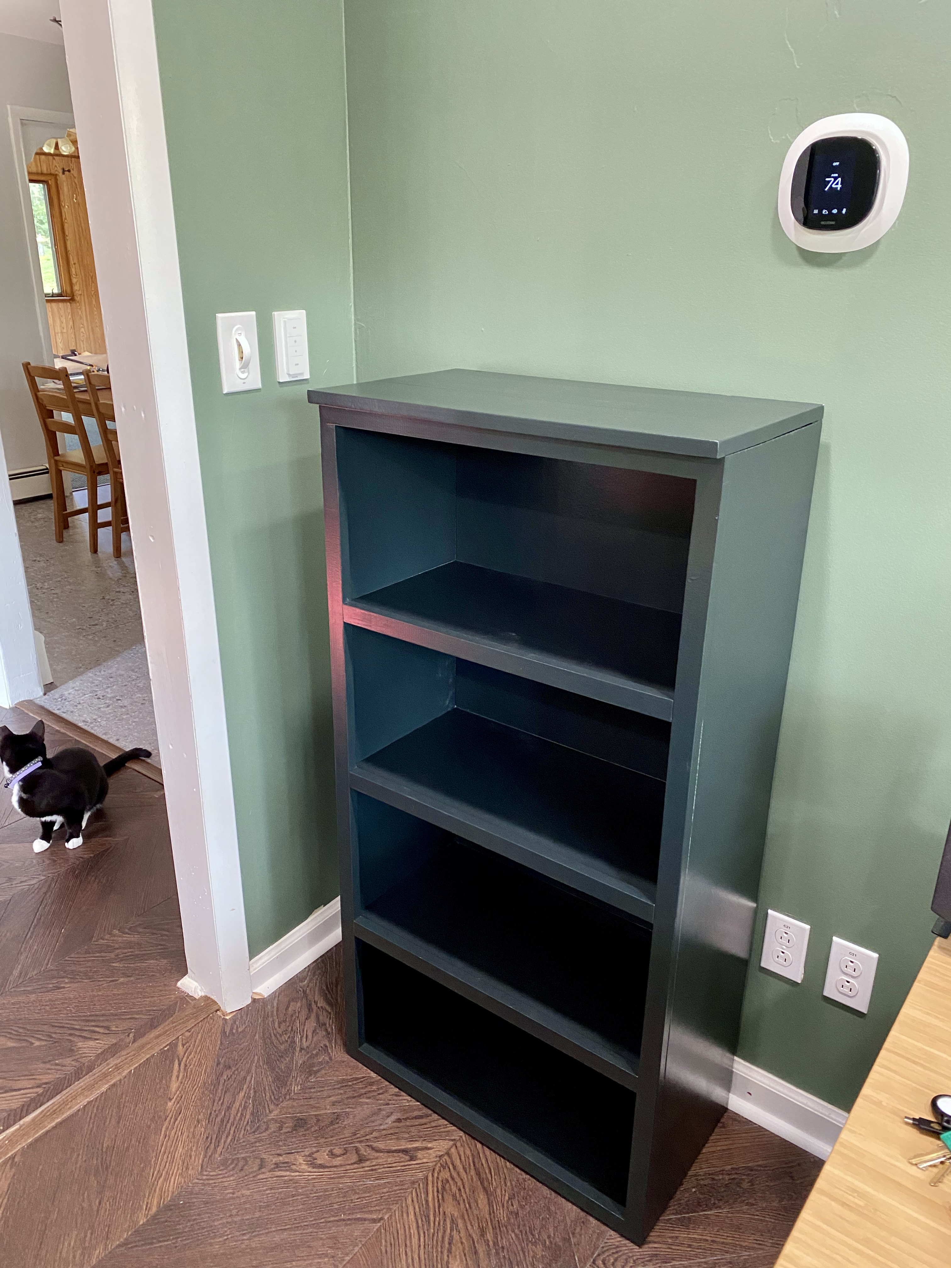 Sanded and primed with Killz3, then topcoated with Benjamin Moore Advance in Black Forest Green. Applied finish with an airless paint sprayer for the first time—achieved excellent results on the exterior. Completed August 2021.