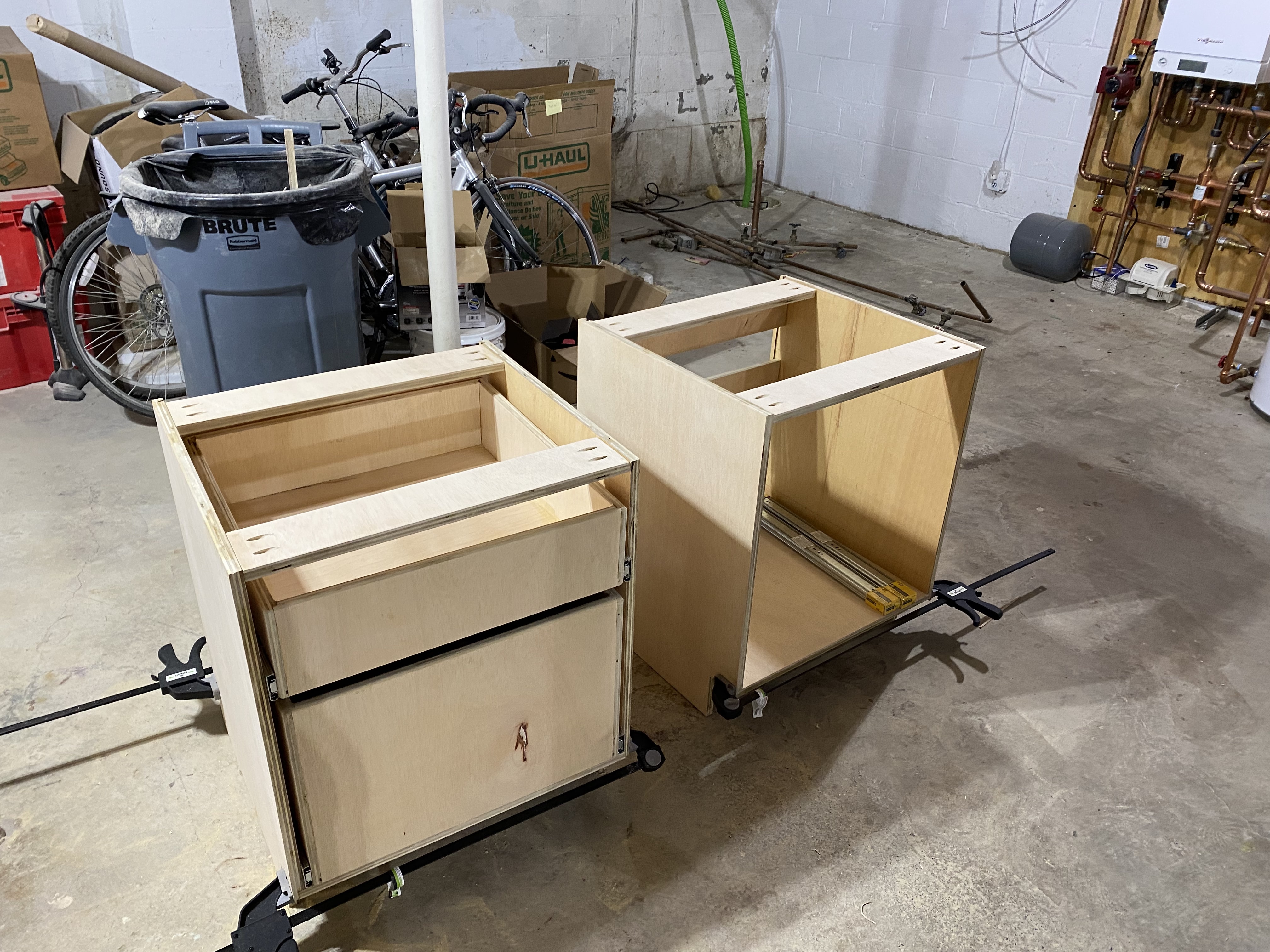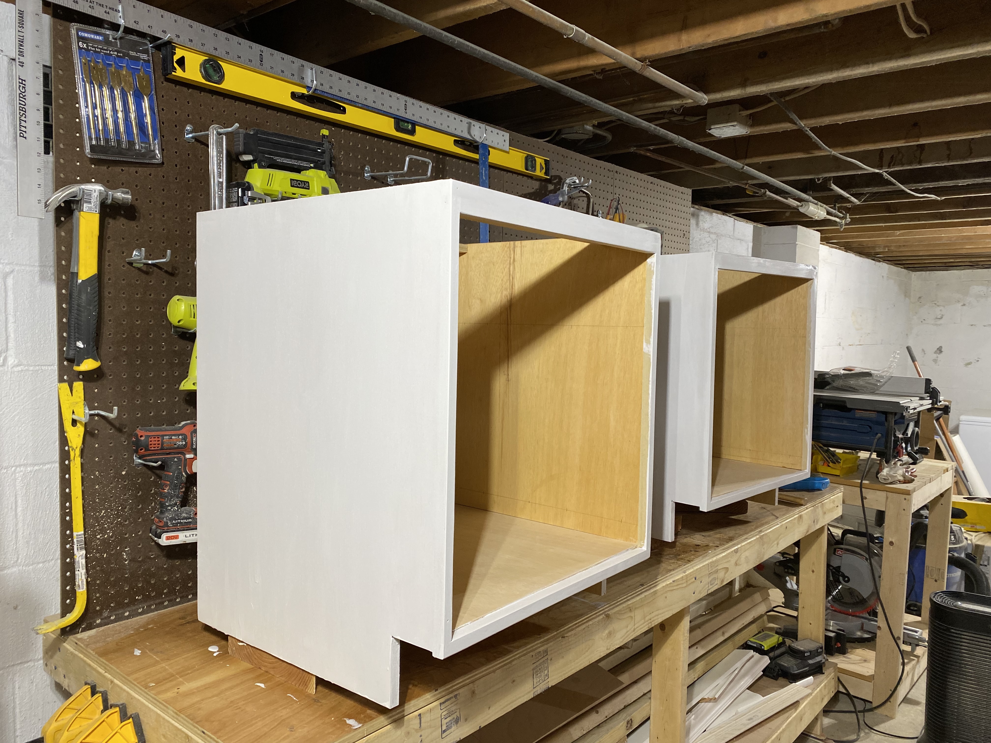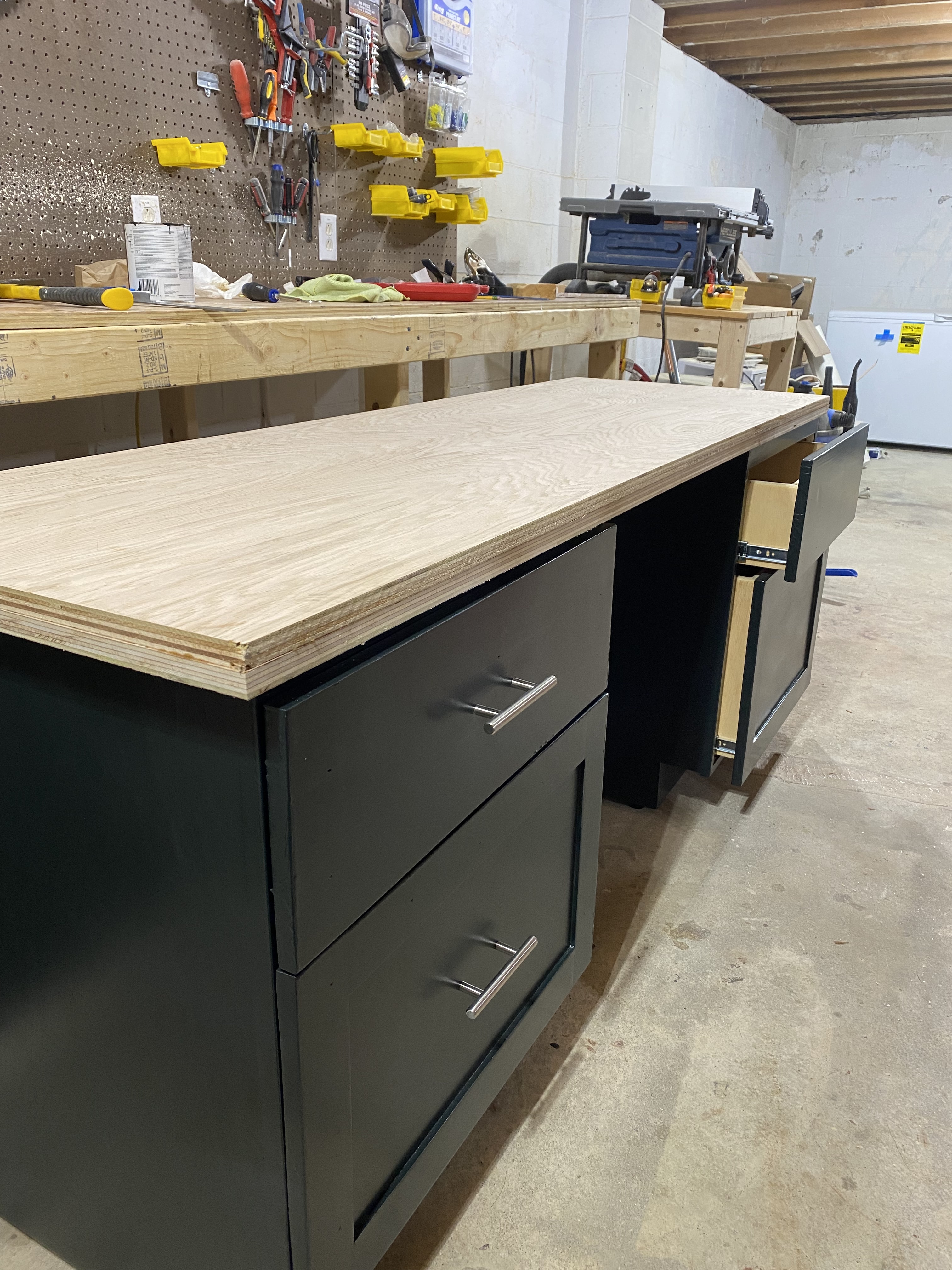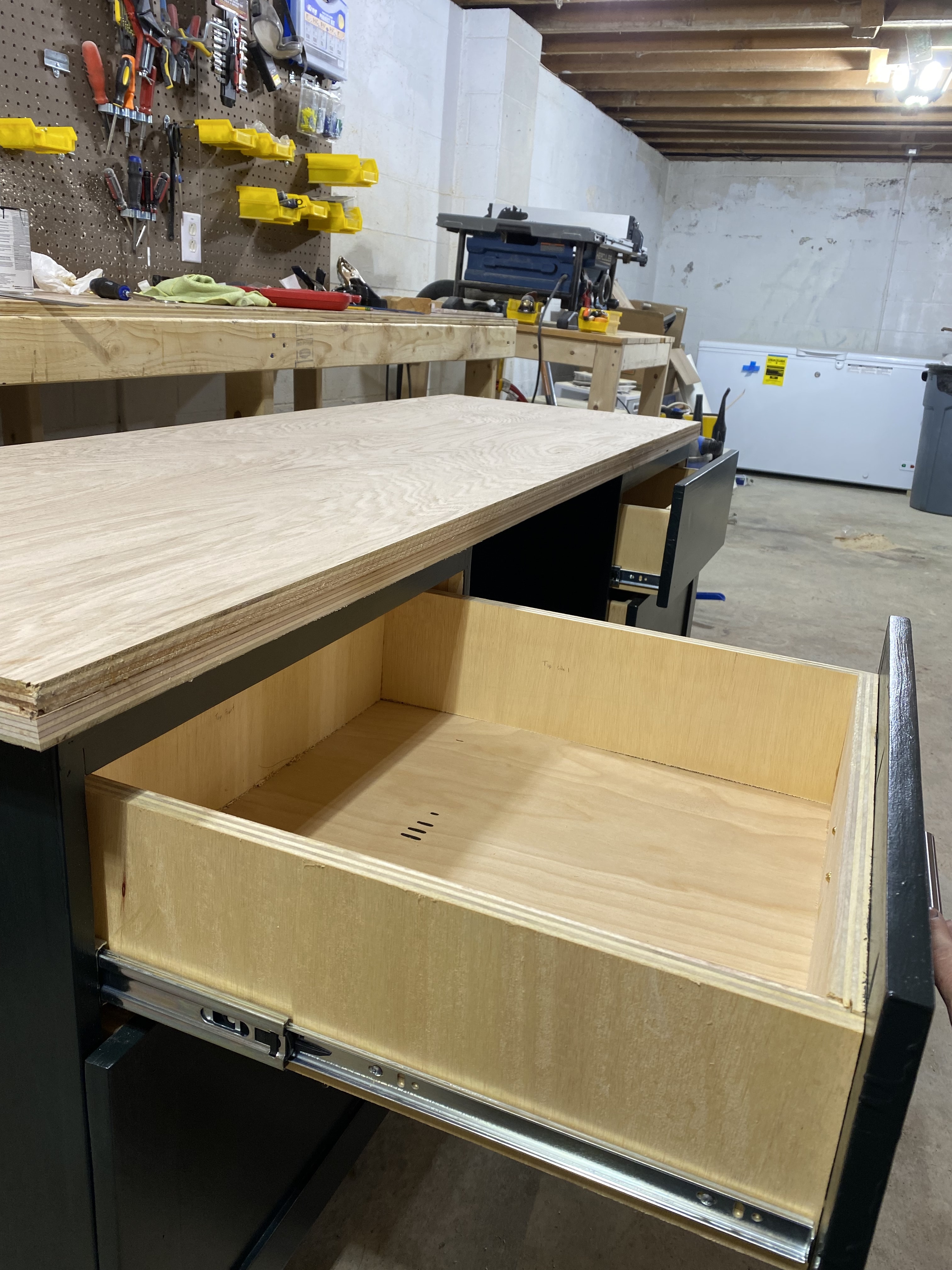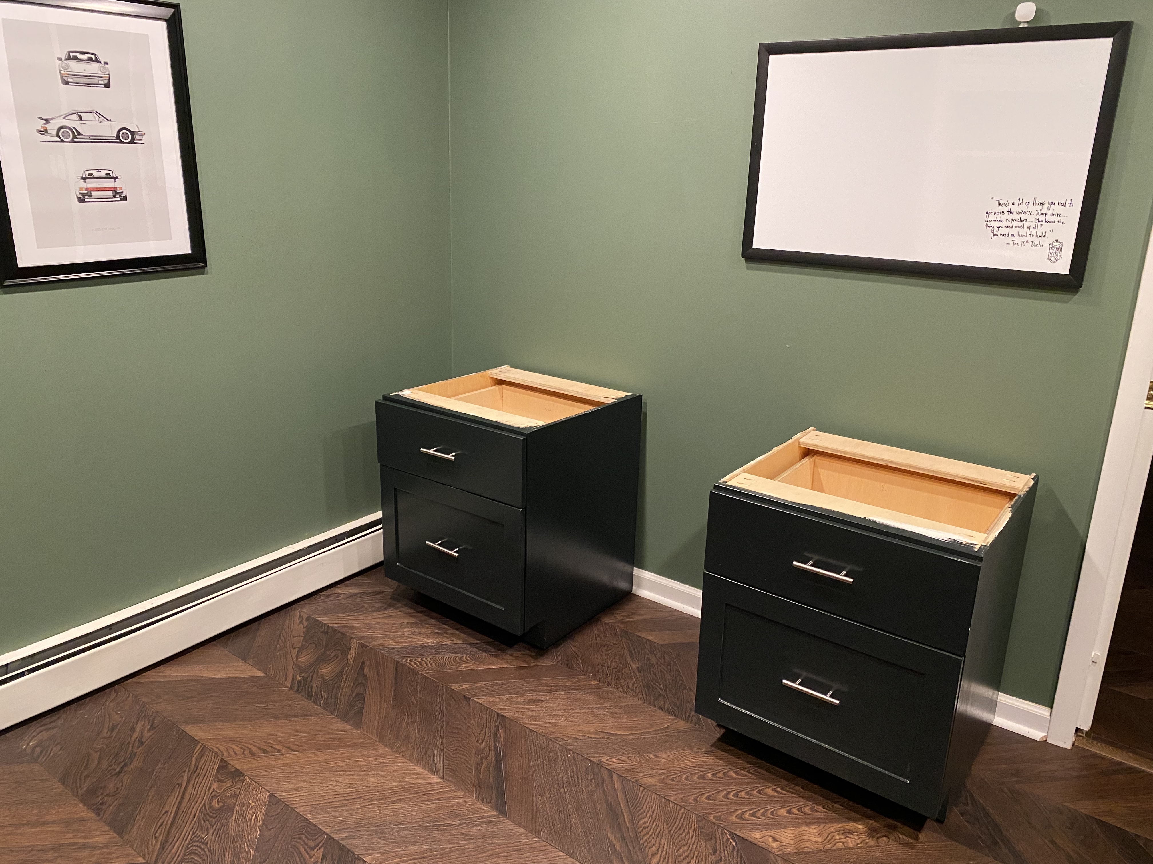 Two unpainted sande plywood cabinet boxes in the workshop, showing the bare construction with drawer slides installed and wheels attached for mobilityCabinet boxes after painting white, resting on the workbench with doors open to show the natural sande plywood interiorsPainted cabinets with red oak plywood countertop in the workshop, showing the finished exterior with modern bar pulls on the drawer frontsClose-up of an open drawer showing the full-extension ball-bearing slides and natural plywood interior constructionTwo painted cabinet units positioned separately in the home office, showing the open-top design ready to receive the countertopCompleted desk installation with red oak countertop spanning between two cabinet units, creating a cohesive workspace against the sage green wall