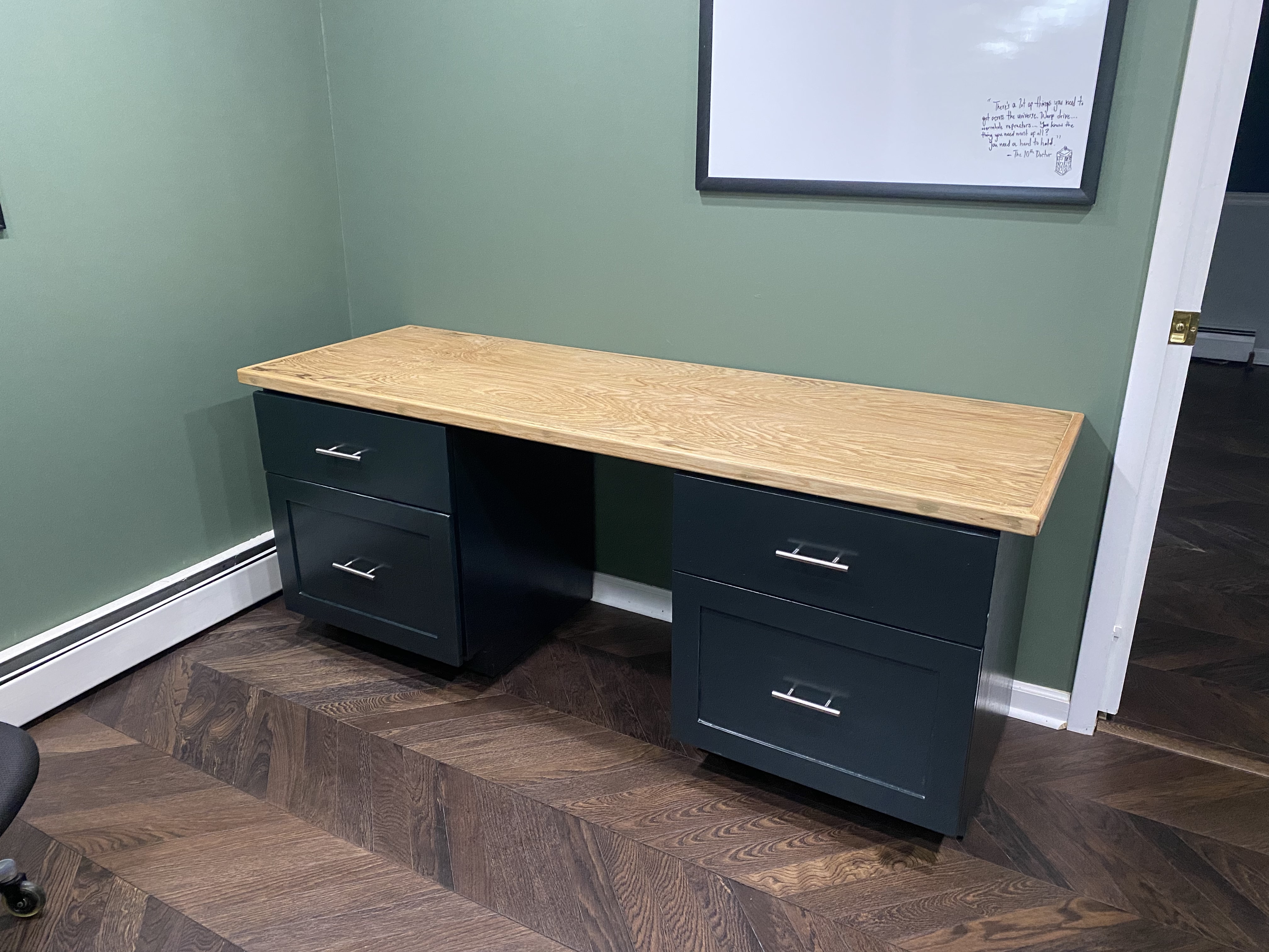 Home office cabinets with red oak top as auxiliary desk space. Cabinets are painted sande plywood. Top is unstained red oak finished with satin polyurethane.