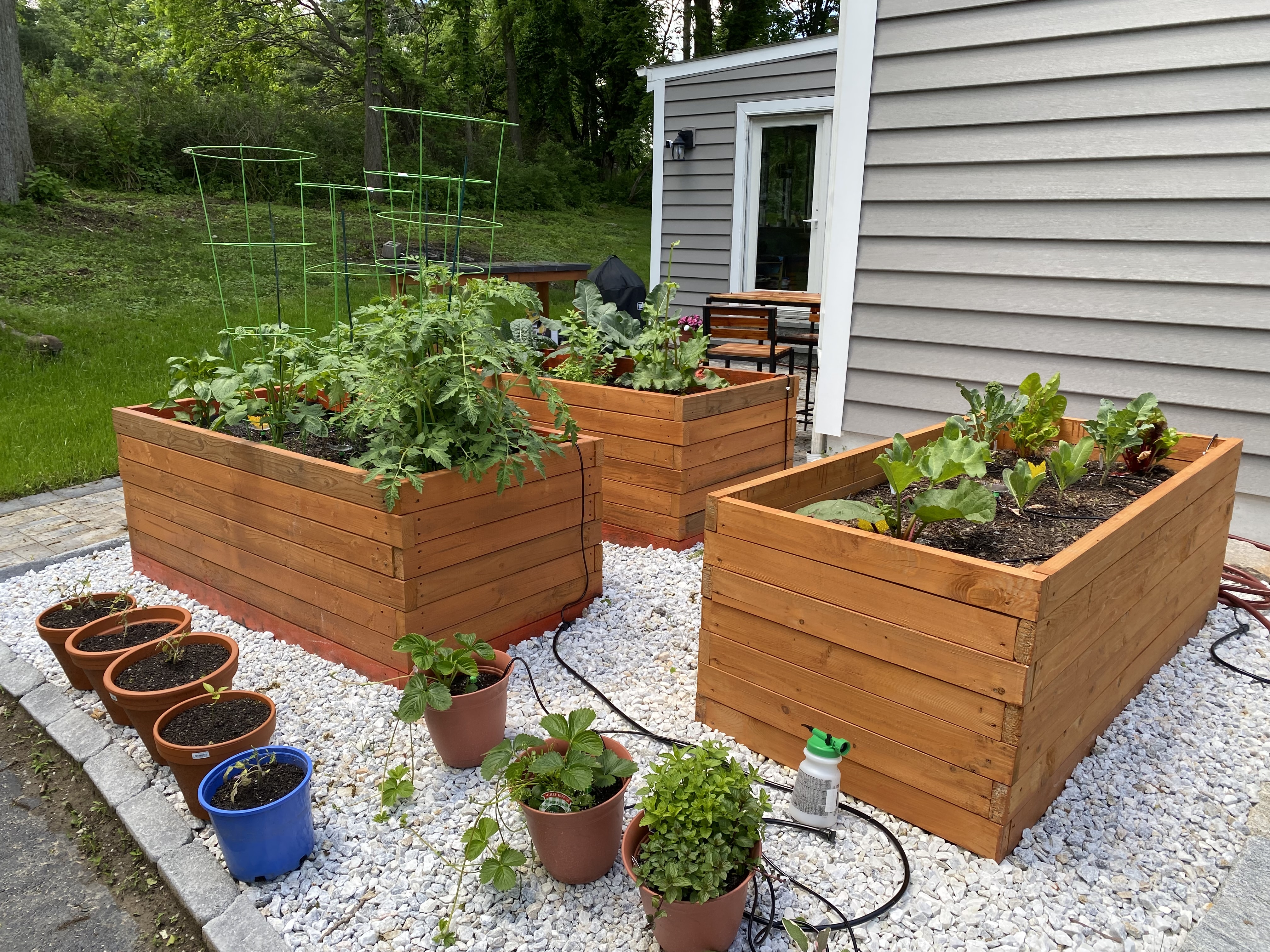 Raised vegetable garden beds made from SPF framing lumber. Finished with cedar tinted deck stain. Completed June 2022.