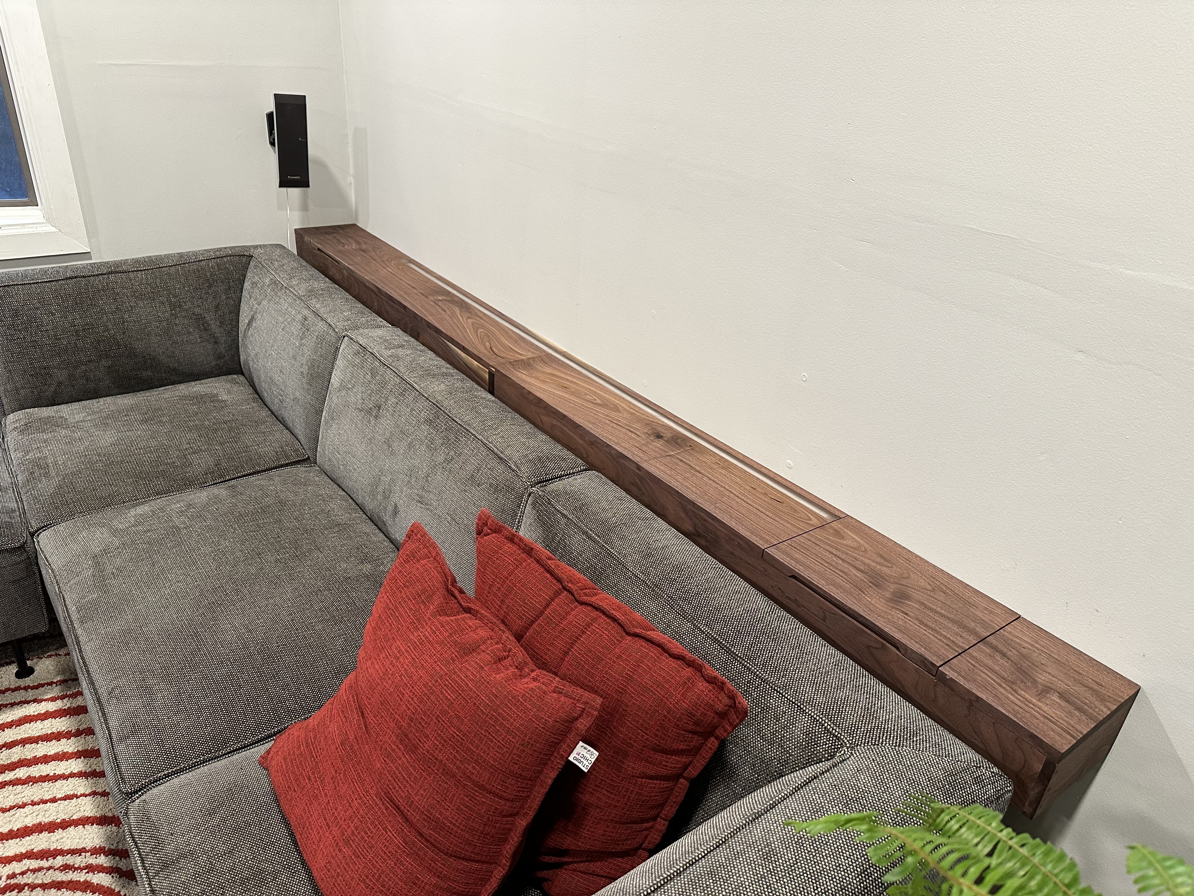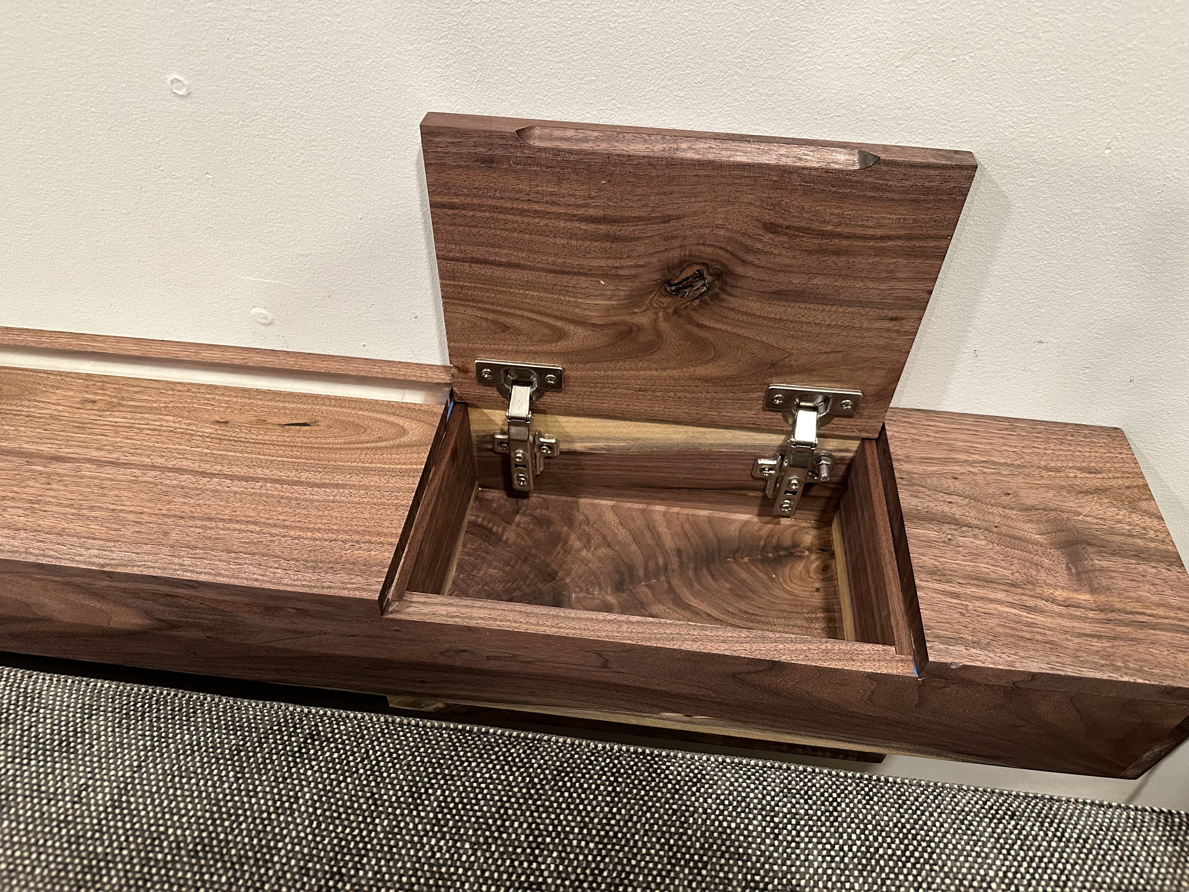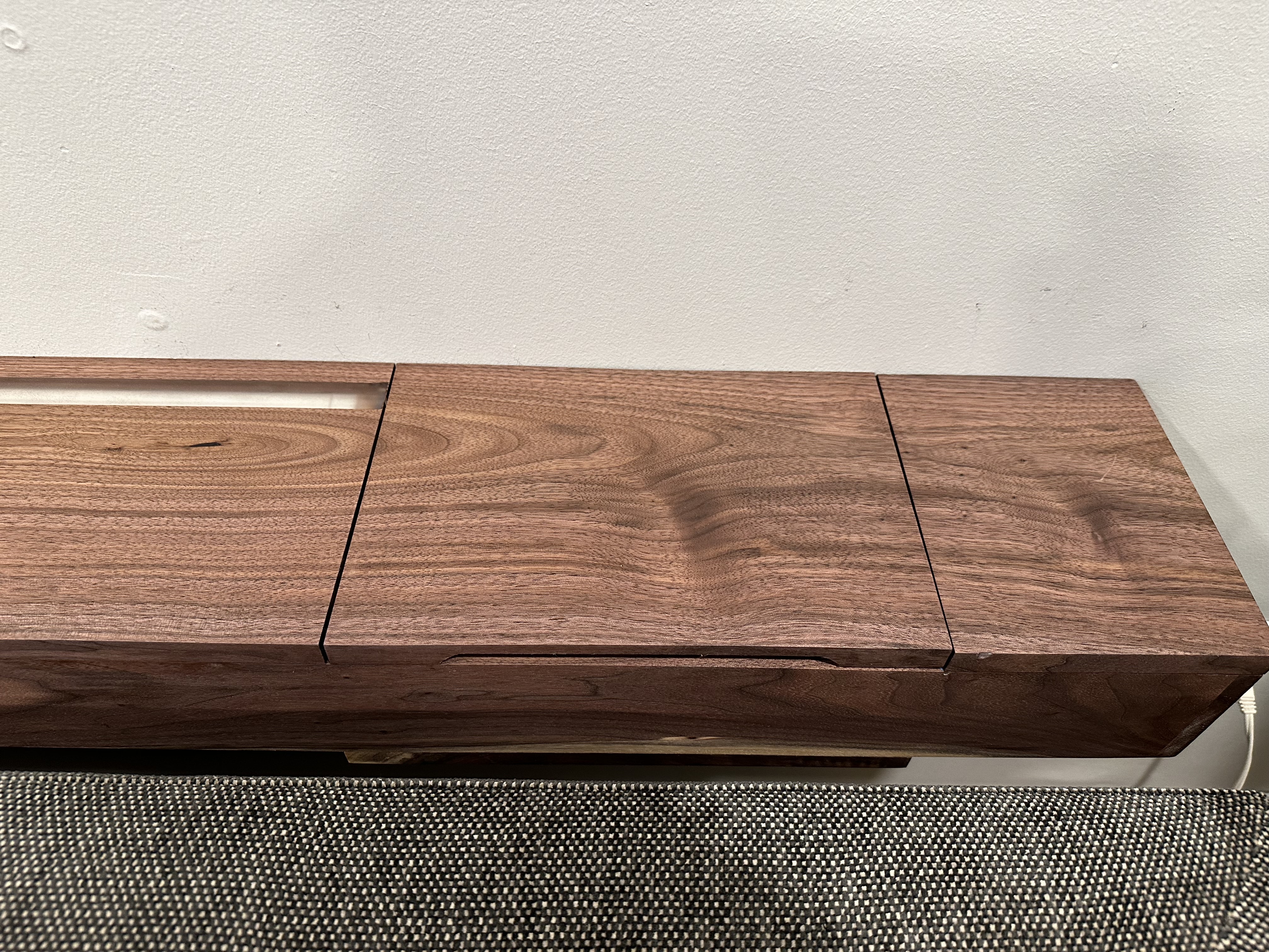 Wall-mounted frame construction showing internal compartments and LED channel running the length of the tableCompleted sofa table mounted to wall showing walnut top with clear epoxy lens covering the LED channelTable positioned behind gray sofa showing the walnut grain and natural color variationClose-up detail of the three-panel top construction showing the book-matched walnut grain pattern and mitered cornersInterior view with lid open revealing hidden storage compartment with brass stop hinges and walnut interiorLED strip illuminated beneath the epoxy lens, casting ambient light upward against the wall
