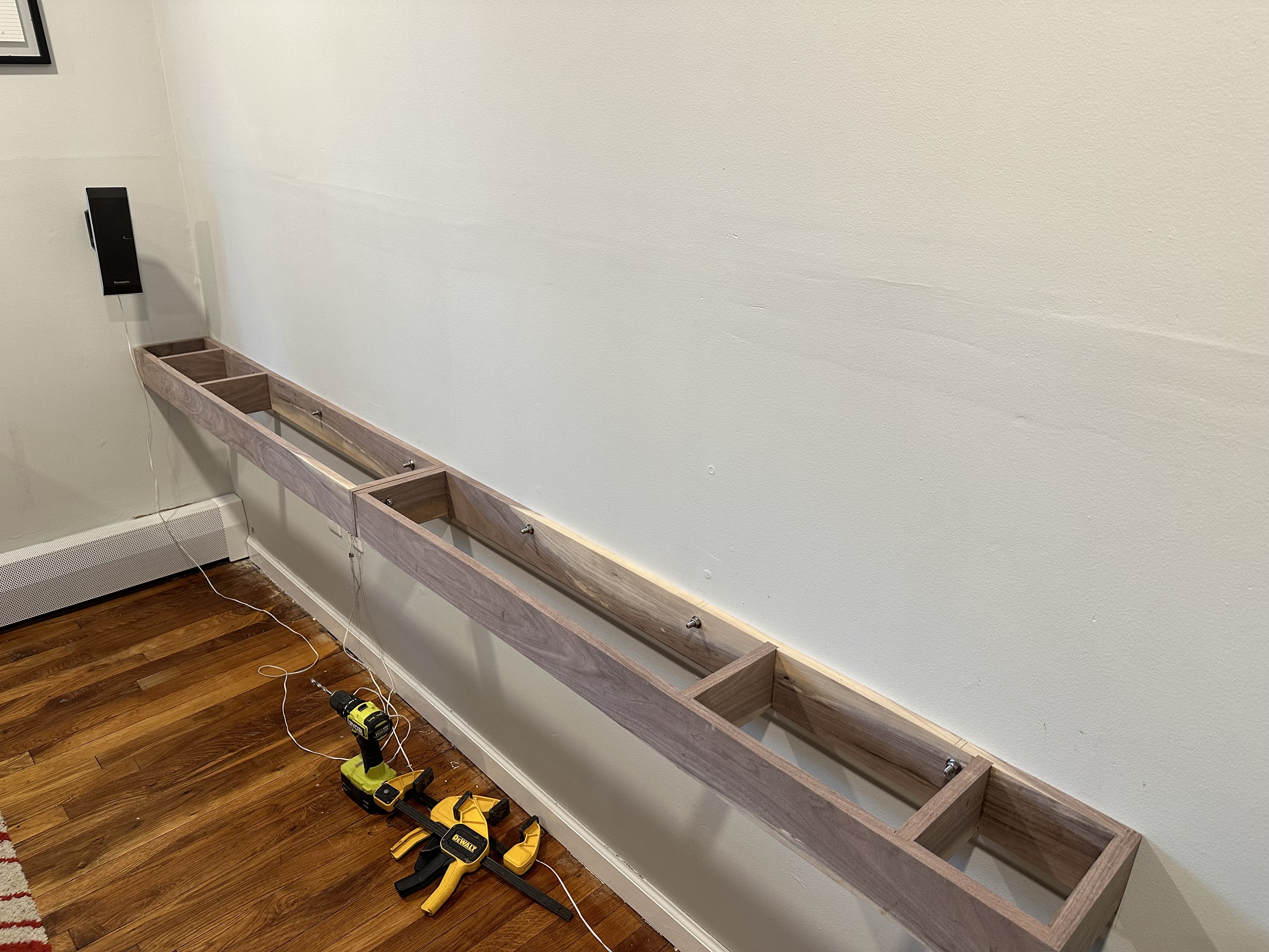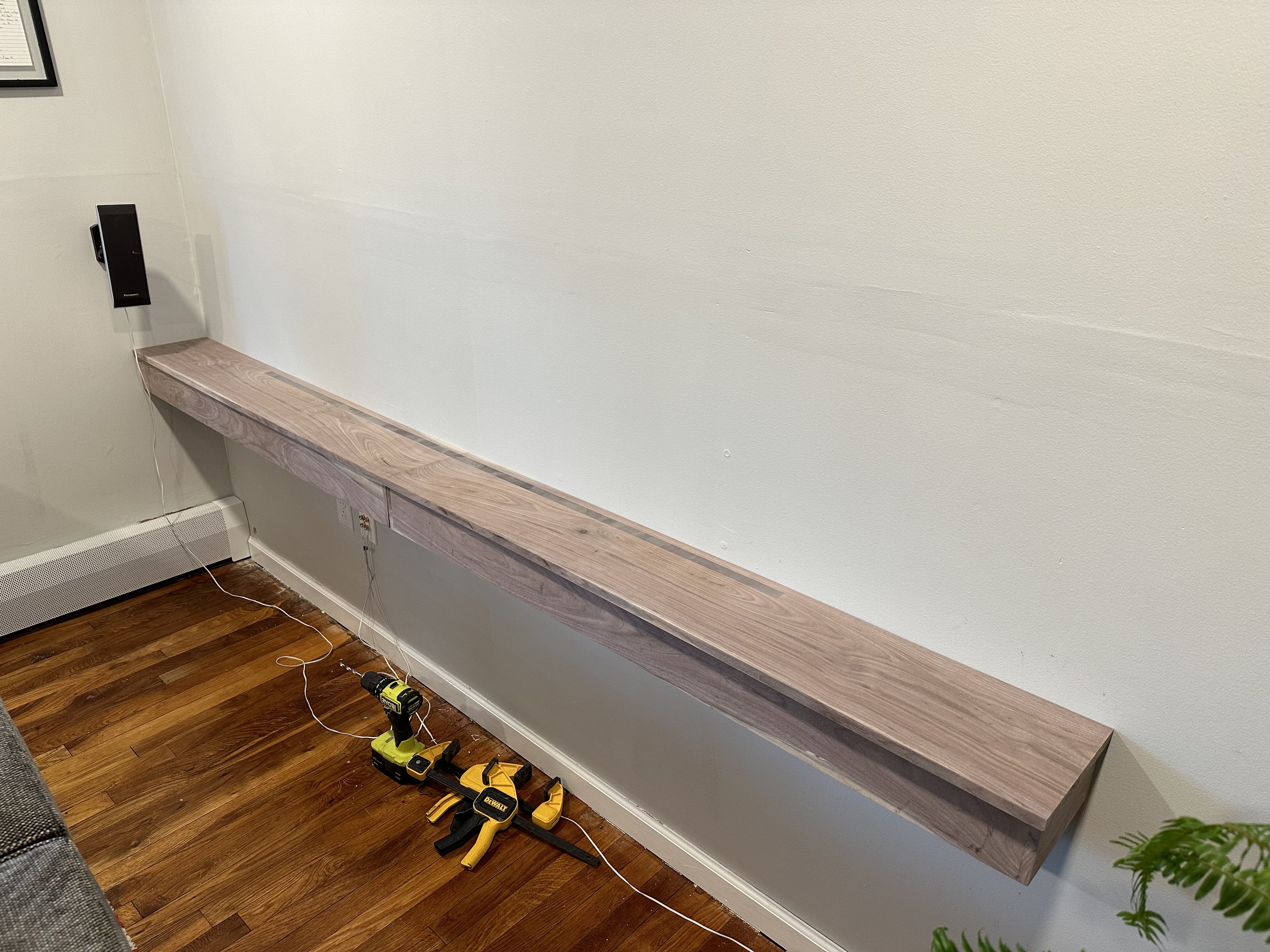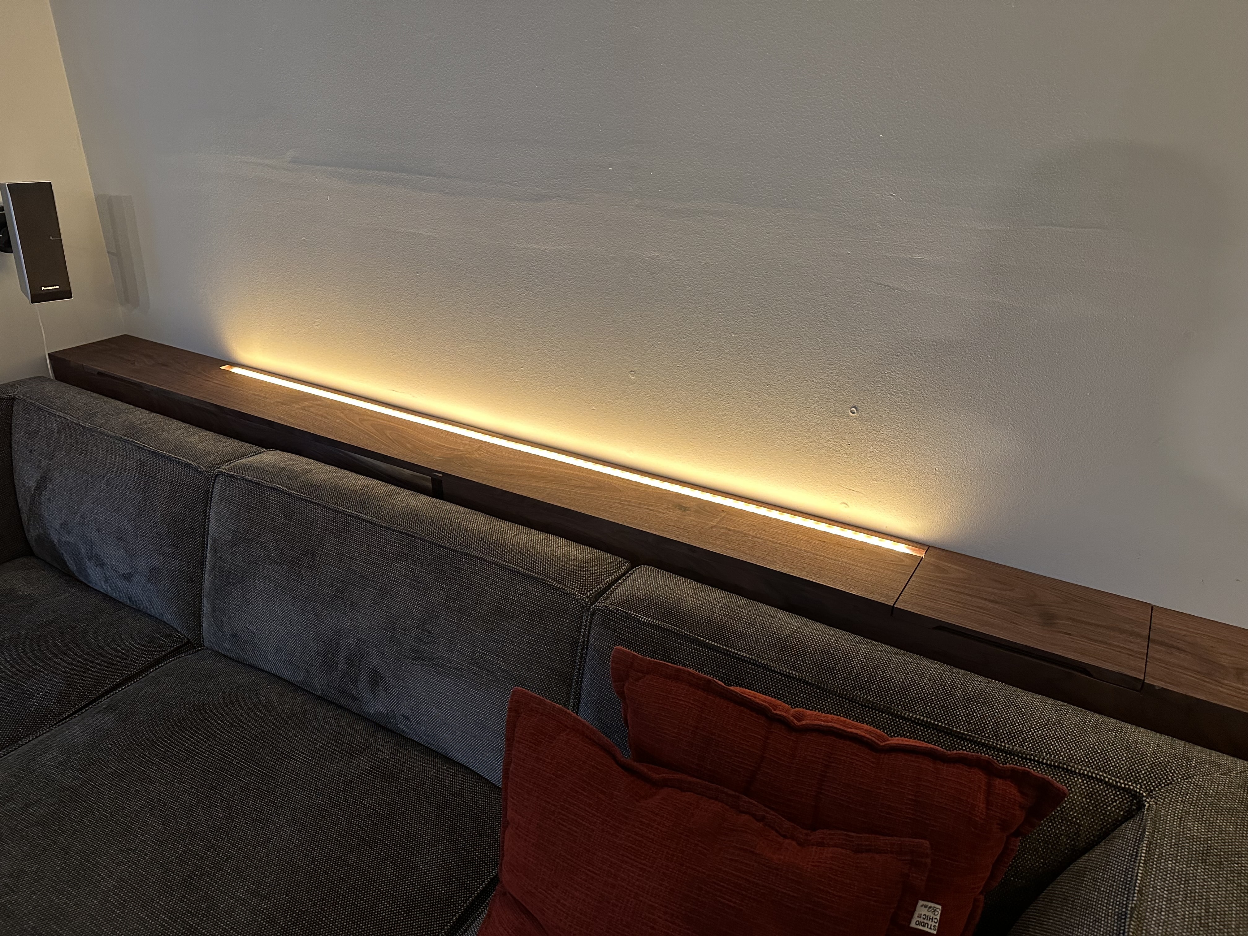 Wall-mounted frame construction showing internal compartments and LED channel running the length of the tableCompleted sofa table mounted to wall showing walnut top with clear epoxy lens covering the LED channelTable positioned behind gray sofa showing the walnut grain and natural color variationClose-up detail of the three-panel top construction showing the book-matched walnut grain pattern and mitered cornersInterior view with lid open revealing hidden storage compartment with brass stop hinges and walnut interiorLED strip illuminated beneath the epoxy lens, casting ambient light upward against the wall