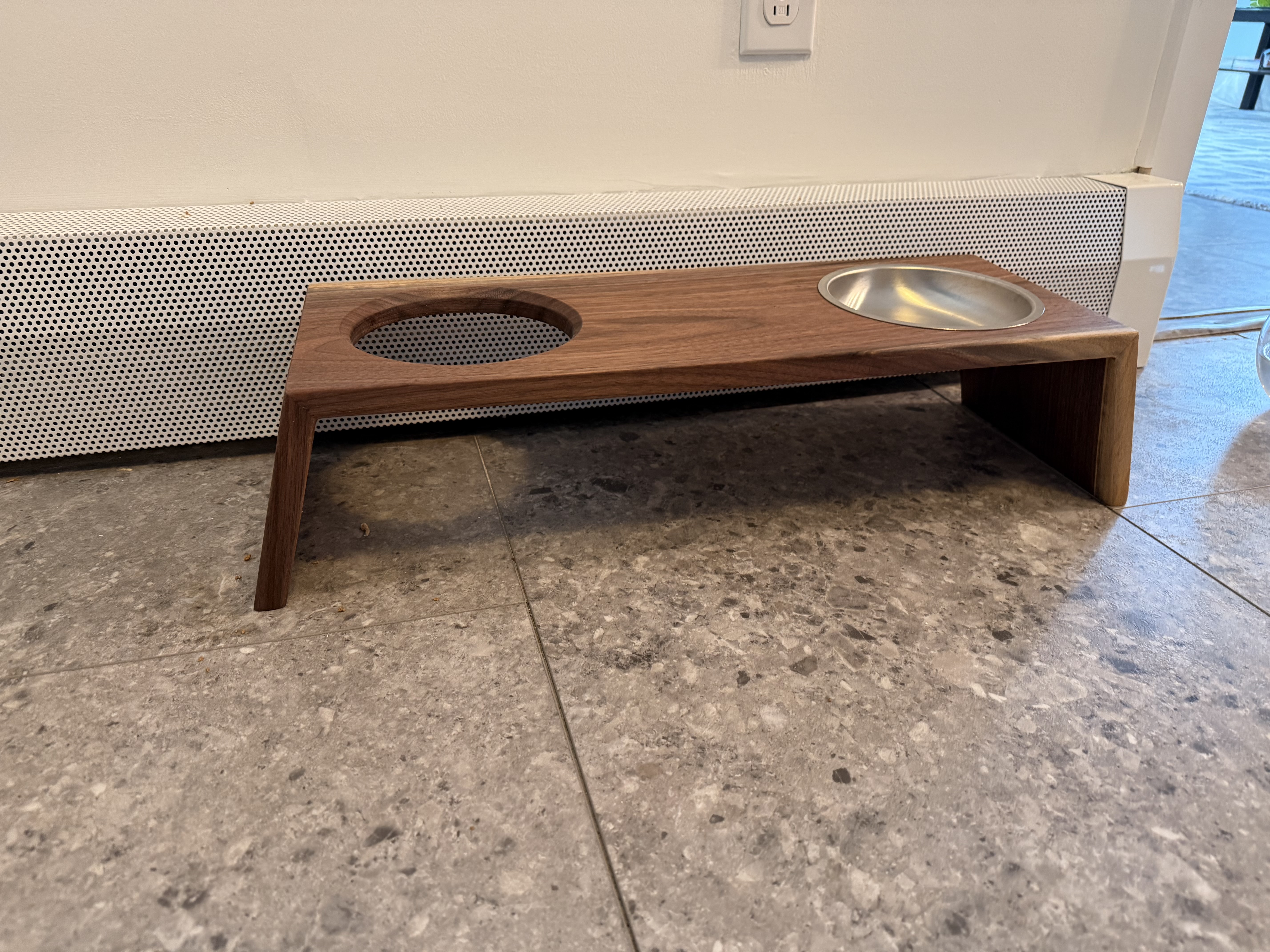 Stand for cat food bowls. Made from air-dried walnut and finished with satin wipe-on poly.